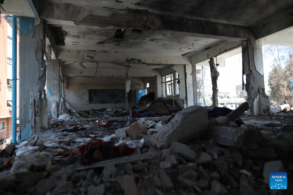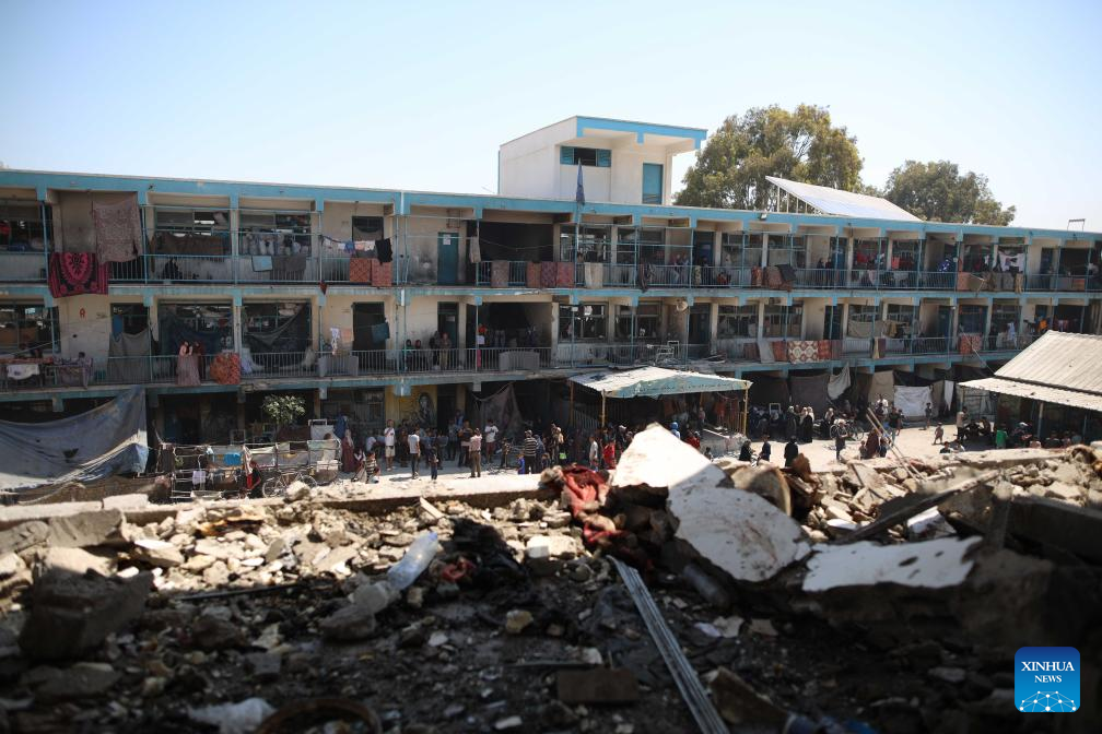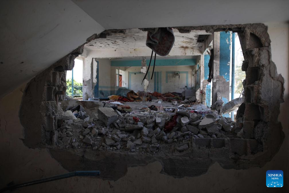 A damaged school building is pictured in the Nuseirat camp in the central Gaza Strip after an Israeli air strike, on June 6, 2024. At least 35 Palestinians were killed and dozens of others injured in an Israeli air strike targeting a school housing displaced people in the Nuseirat camp in the central Gaza Strip, the Palestinian official news agency WAFA reported on Thursday. (Photo by Marwan Dawood/Xinhua)