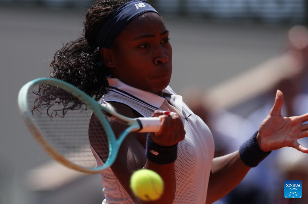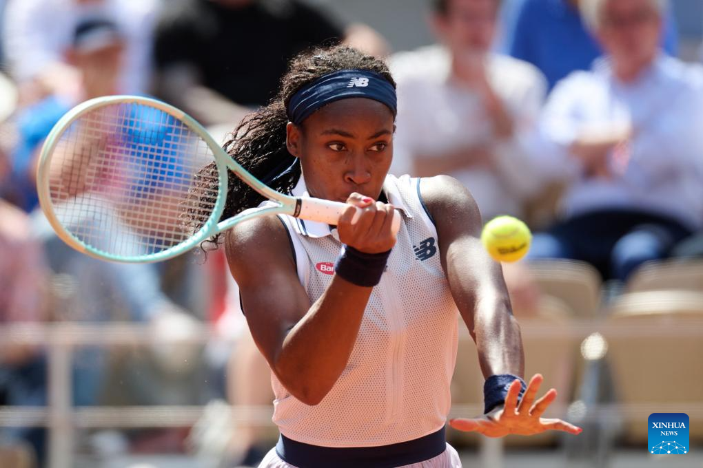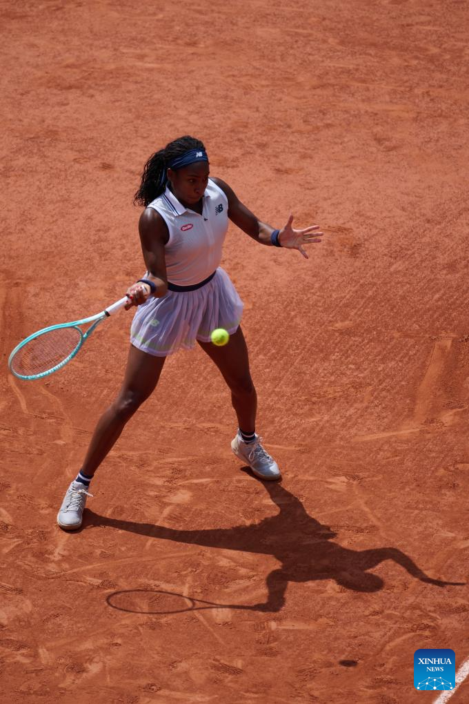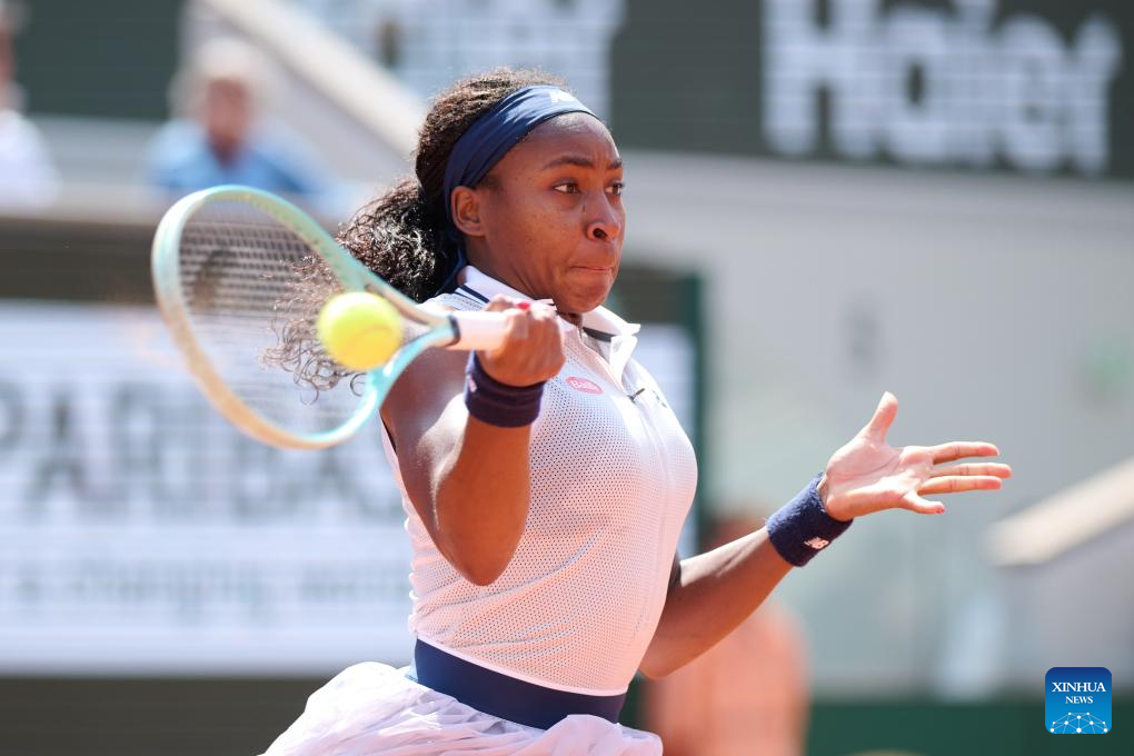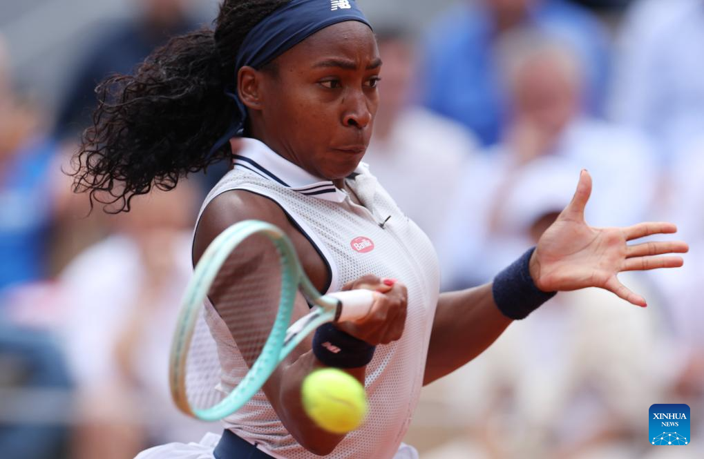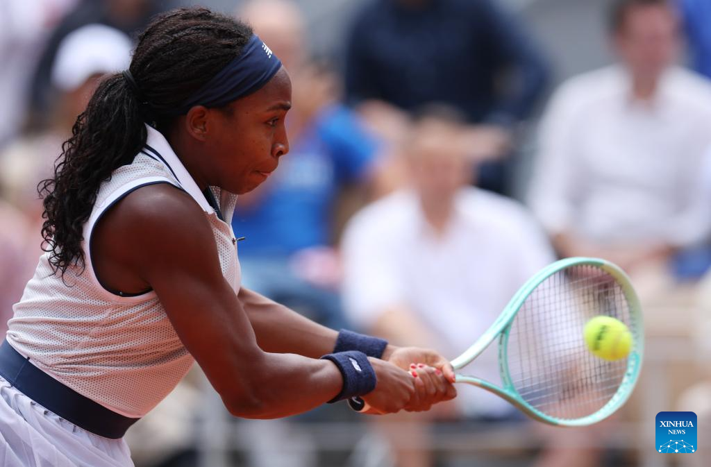 Coco Gauff returns a shot during the women's singles semifinal match between Coco Gauff of the United States and Iga Swiatek of Poland at the French Open tennis tournament at Roland Garros in Paris, France, on June 6, 2024. (Xinhua/Meng Dingbo)