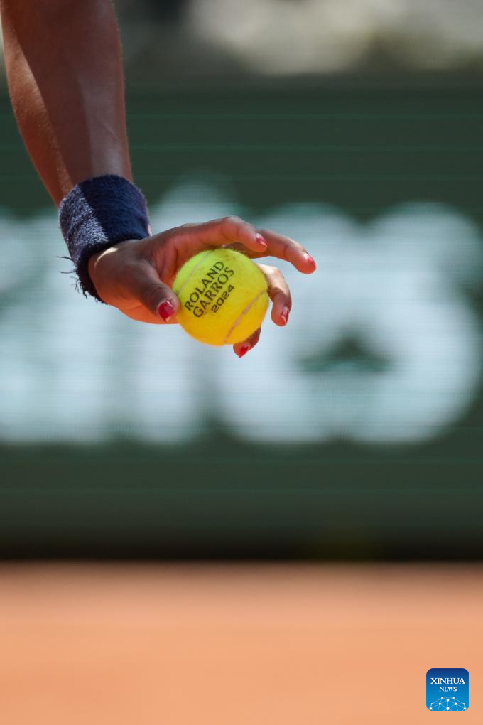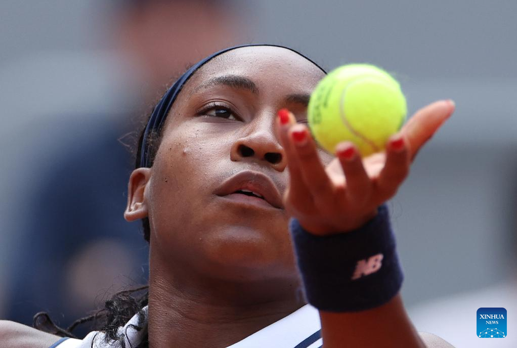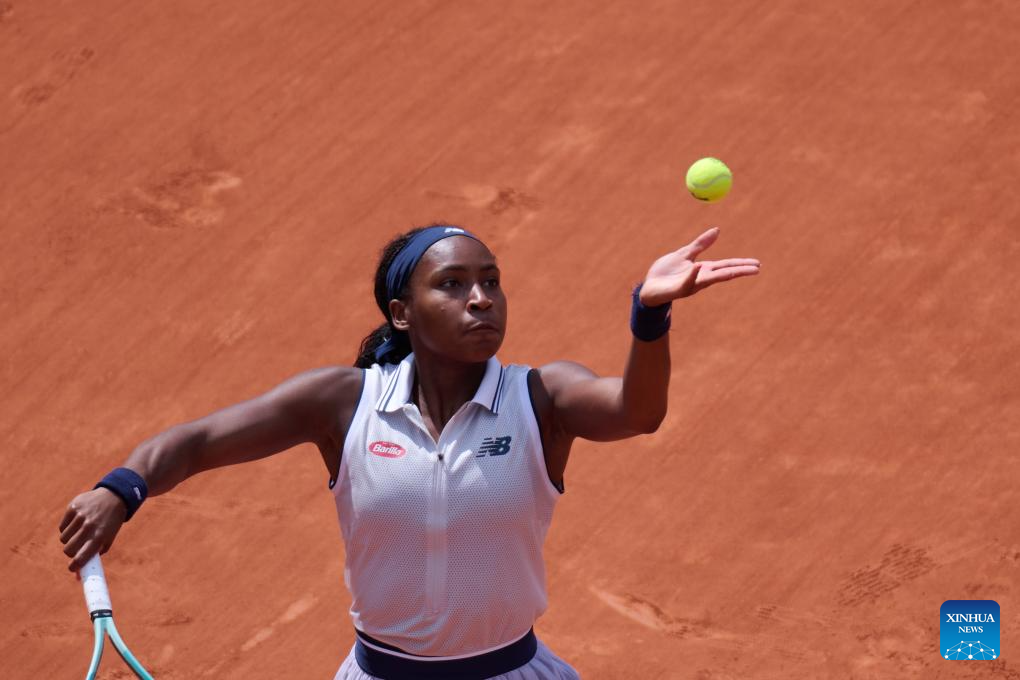 Coco Gauff prepares to serve during the women's singles semifinal match between Coco Gauff of the United States and Iga Swiatek of Poland at the French Open tennis tournament at Roland Garros in Paris, France, on June 6, 2024. (Xinhua/Meng Dingbo)
