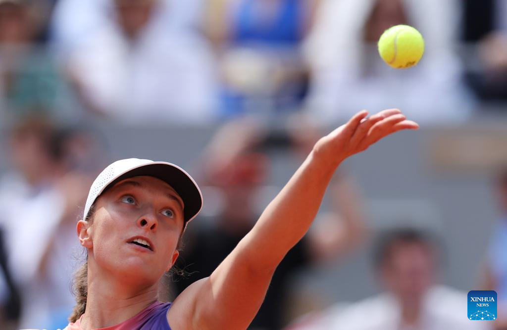 Iga Swiatek serves during the women's singles semifinal match between Coco Gauff of the United States and Iga Swiatek of Poland at the French Open tennis tournament at Roland Garros in Paris, France, on June 6, 2024. (Xinhua/Gao Jing)