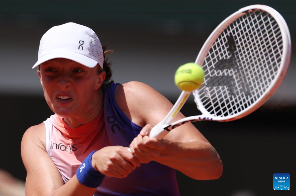 Iga Swiatek returns a shot during the women's singles semifinal match between Coco Gauff of the United States and Iga Swiatek of Poland at the French Open tennis tournament at Roland Garros in Paris, France, on June 6, 2024. (Xinhua/Meng Dingbo)