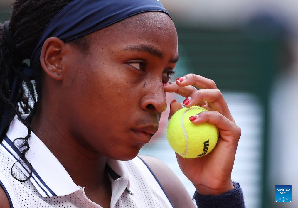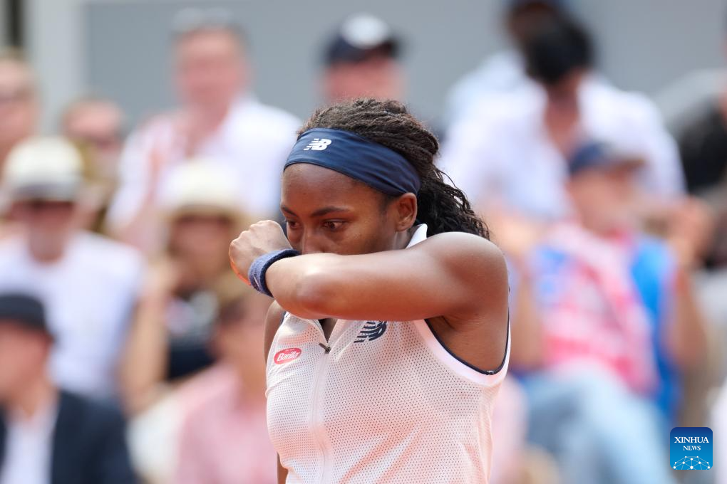 Coco Gauff reacts during the women's singles semifinal match between Coco Gauff of the United States and Iga Swiatek of Poland at the French Open tennis tournament at Roland Garros in Paris, France, on June 6, 2024. (Xinhua/Meng Dingbo)