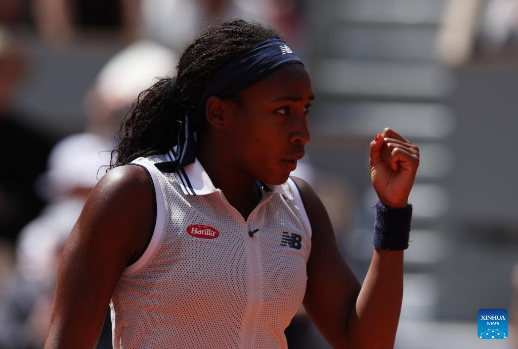 Coco Gauff celebrates a score during the women's singles semifinal match between Coco Gauff of the United States and Iga Swiatek of Poland at the French Open tennis tournament at Roland Garros in Paris, France, on June 6, 2024. (Xinhua/Gao Jing)