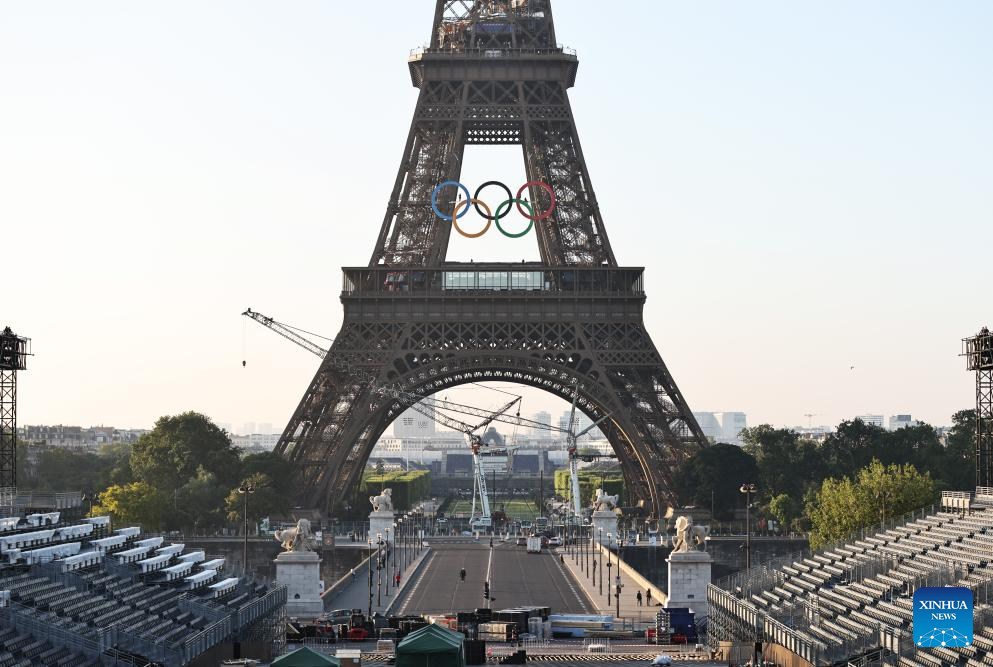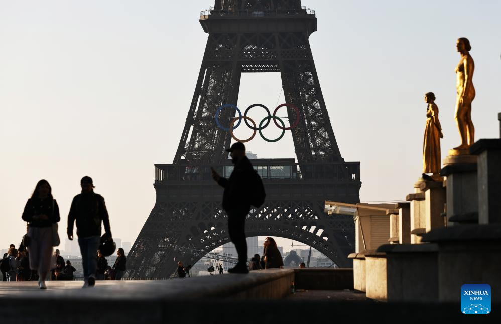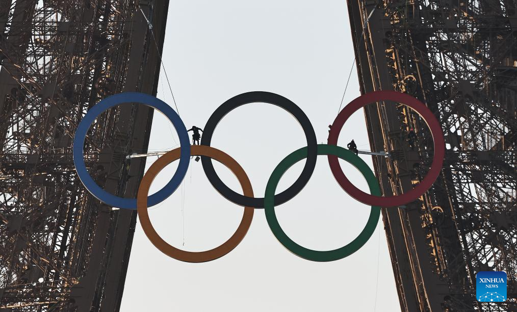 PARIS, June 7 (Xinhua) -- The iconic five Olympic rings, adorning the exterior of the world-renowned Eiffel Tower, were unveiled on Thursday, marking the 50-day countdown to the Paris 2024 Olympic Games.