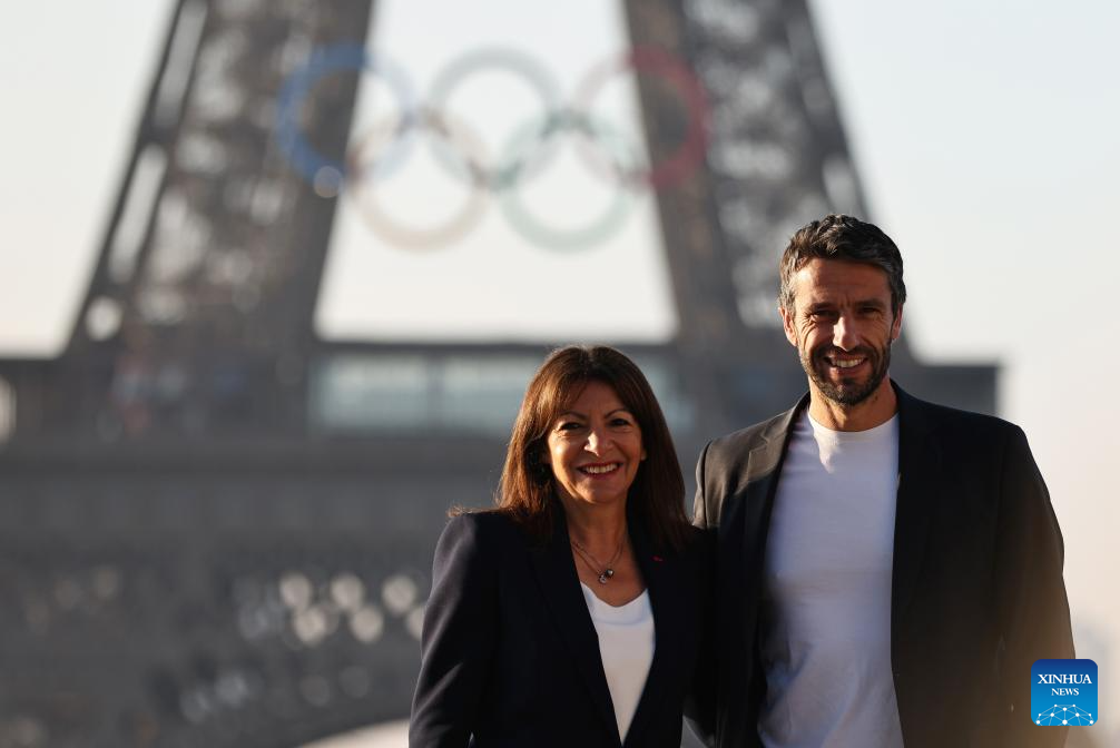 President of the Paris 2024 Olympic Games Organizing Committee Tony Estanguet (R) and Paris Mayor Anne Hidalgo pose with the Olympic rings on the Eiffel Tower, in Paris, France, on June 7, 2024. The Olympics rings are unveiled on the Eiffel Tower early in the morning of Friday as the French capital marks 50 days until the start of the upcoming Paris 2024 Olympic Games. (Xinhua/Gao Jing)