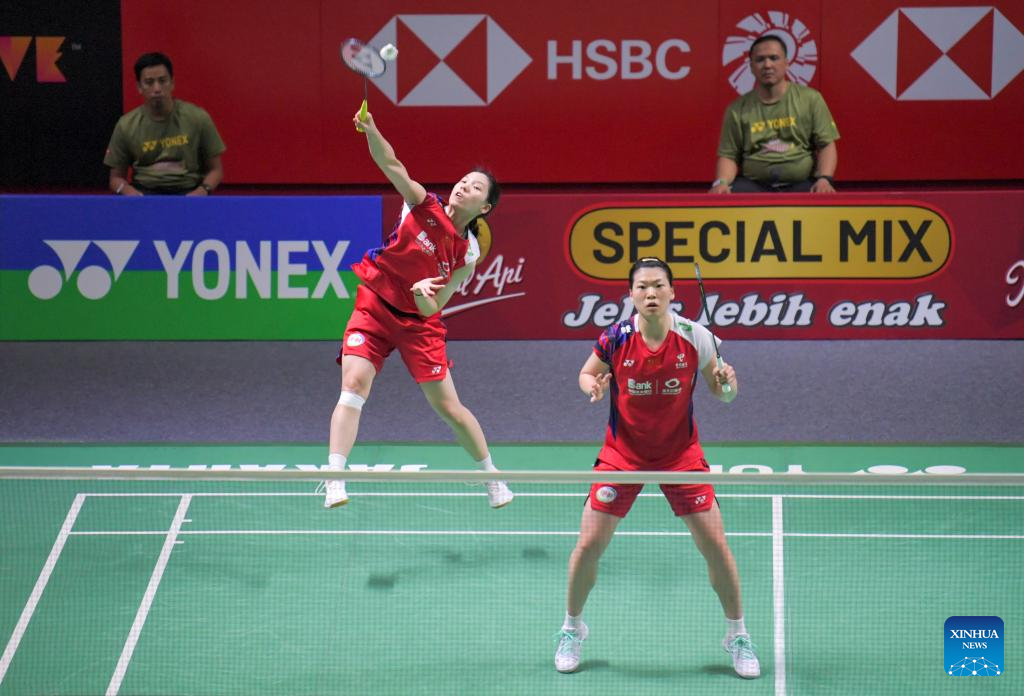 Chen Qingchen/Jia Yifan (L) compete during the women's doubles quarterfinal match between Chen Qingchen/Jia Yifan of China and Pearly Tan/Thinaah Muralitharan of Malaysia at 2024 Indonesia Open badminton tournament in Jakarta, Indonesia, June 7, 2024. (Xinhua/Xu Qin)