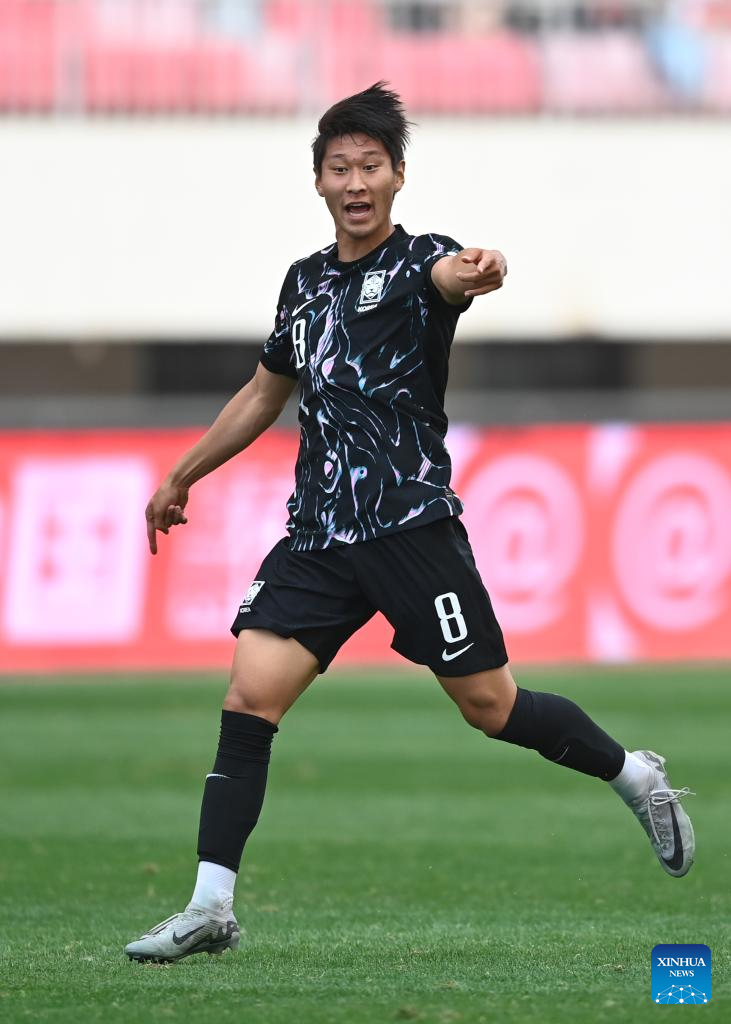Jin Junseo of South Korea gestrues after scoring a goal during a friendly football match between the U19 teams of South Korea and Vietnam in Weinan, northwest China's Shaanxi Province, June 8, 2024. (Xinhua/Zou Jingyi)
