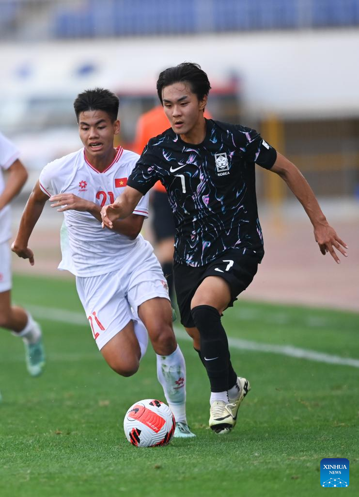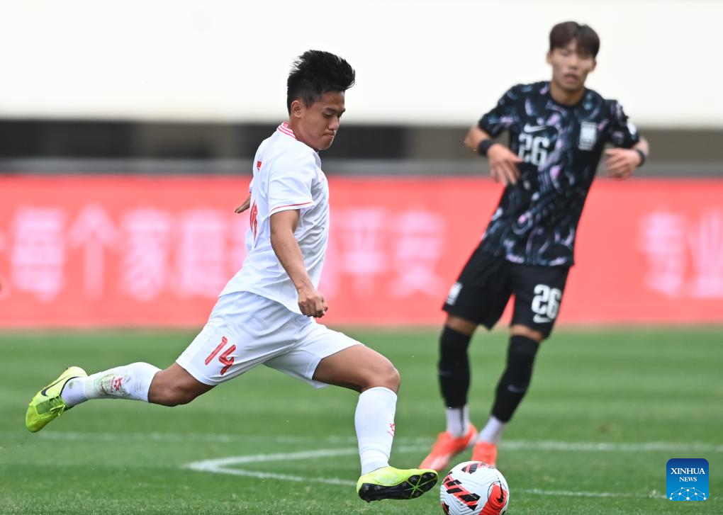 Yoon Doyong (R) of South Korea controls the ball during a friendly football match between the U19 teams of South Korea and Vietnam in Weinan, northwest China's Shaanxi Province, June 8, 2024. (Xinhua/Zou Jingyi)