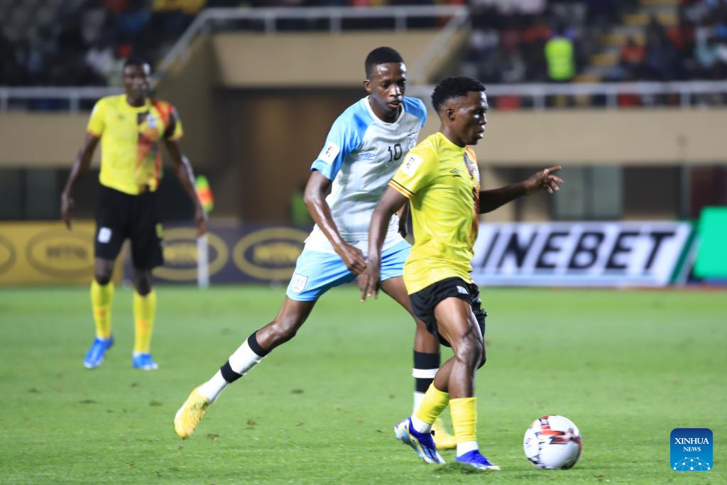 Travis Mutyaba (R) of Uganda competes for the ball during the FIFA World Cup 2026 qualifier match between Uganda and Botswana at Mandela National Stadium in Kampala, the capital of Uganda, on June 7, 2026. (Photo by Hajarah Nalwadda/Xinhua)