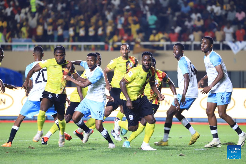 Players of Uganda (yellow) and Botswana (white) compete during the FIFA World Cup 2026 qualifier match between Uganda and Botswana at Mandela National Stadium in Kampala, the capital of Uganda, on June 7, 2026. (Photo by Hajarah Nalwadda/Xinhua)