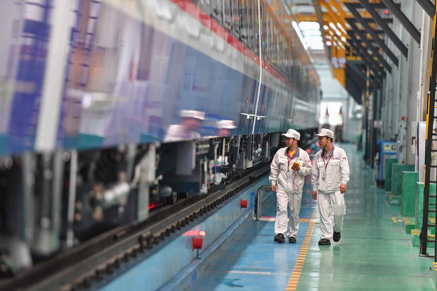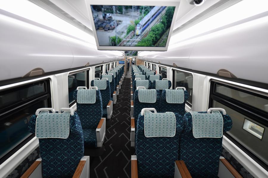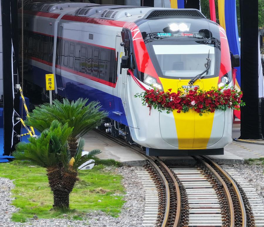 This photo taken on June 7, 2024 shows a roll-off ceremony of a new ETS3 train for Malaysia at CRRC Zhuzhou Locomotive Co., Ltd. in Zhuzhou, central China's Hunan Province. (Xinhua/Chen Zeguo)A drone photo taken on June 7, 2024 shows a new ETS3 train for Malaysia at CRRC Zhuzhou Locomotive Co., Ltd. in Zhuzhou, central China's Hunan Province. (Xinhua/Chen Zeguo)This photo taken on June 7, 2024 shows a carriage of an ETS3 train for Malaysia at CRRC Zhuzhou Locomotive Co., Ltd. in Zhuzhou, central China's Hunan Province. (Xinhua/Chen Zeguo)This photo taken on June 7, 2024 shows the dining area of an ETS3 train for Malaysia at CRRC Zhuzhou Locomotive Co., Ltd. in Zhuzhou, central China's Hunan Province. (Xinhua/Chen Zeguo)A staff member inspects an ETS3 train for Malaysia at CRRC Zhuzhou Locomotive Co., Ltd. in Zhuzhou, central China's Hunan Province, June 7, 2024. (Xinhua/Chen Zeguo)Staff members inspect an ETS3 train for Malaysia at CRRC Zhuzhou Locomotive Co., Ltd. in Zhuzhou, central China's Hunan Province, June 7, 2024. (Xinhua/Chen Zeguo)Staff members inspect an ETS3 train for Malaysia at CRRC Zhuzhou Locomotive Co., Ltd. in Zhuzhou, central China's Hunan Province, June 7, 2024. (Xinhua/Chen Zeguo)■