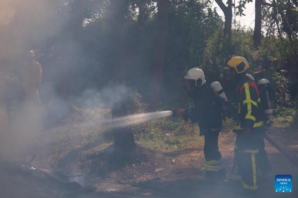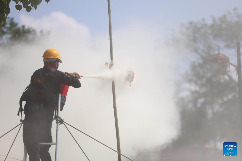 Firefighters try to put out a fire during a fire drill in Lalitpur, Nepal, on June 7, 2024. (Photo by Sulav Shrestha/Xinhua)