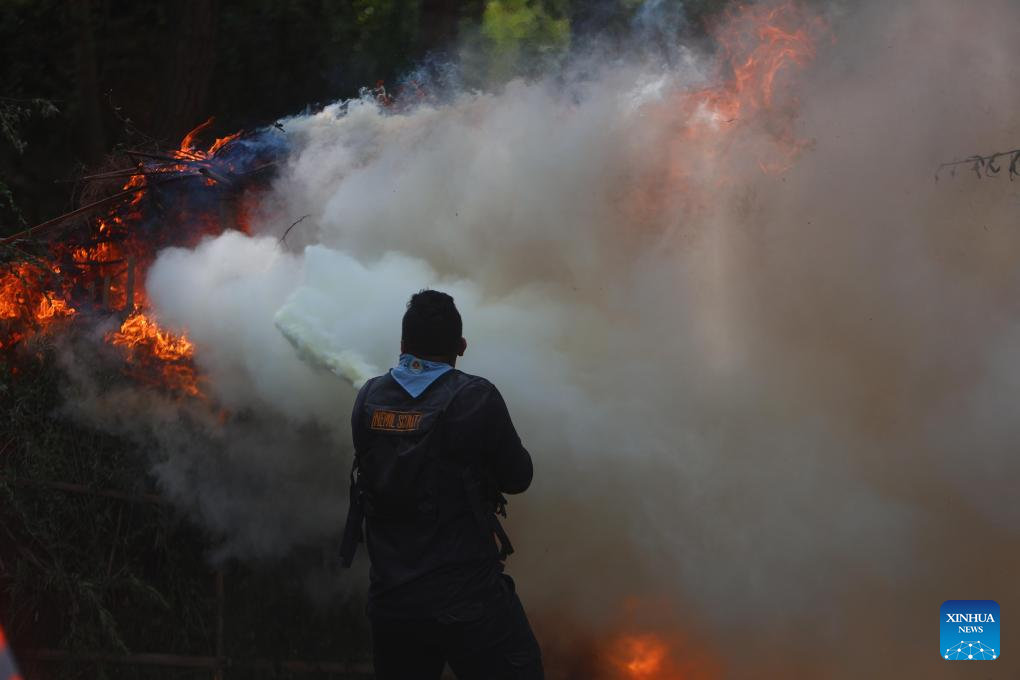 A firefighter tries to put out a fire during a fire drill in Lalitpur, Nepal, on June 7, 2024. (Photo by Sulav Shrestha/Xinhua)
