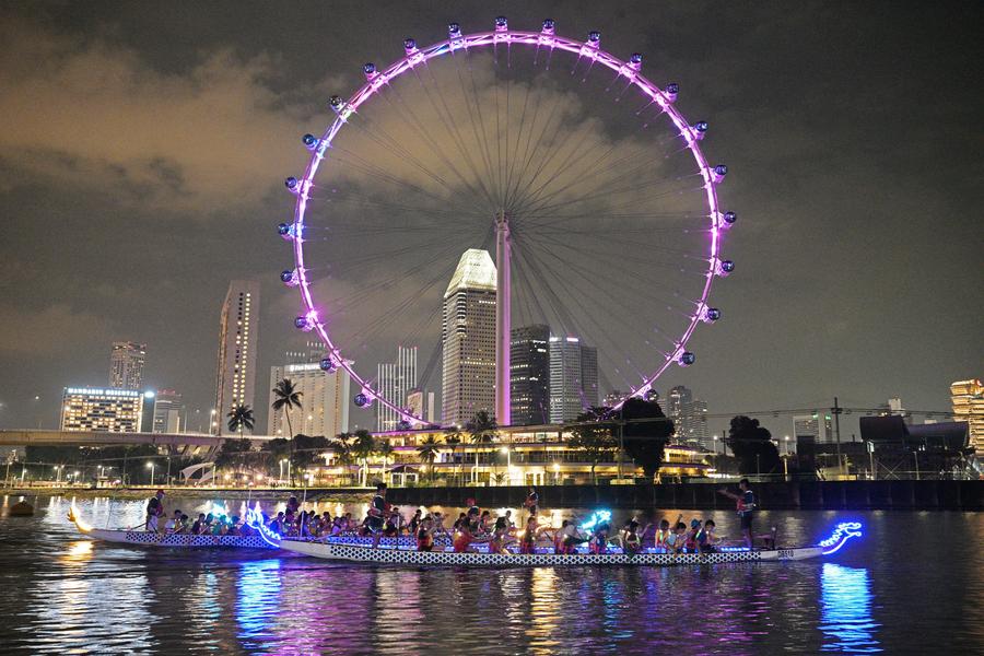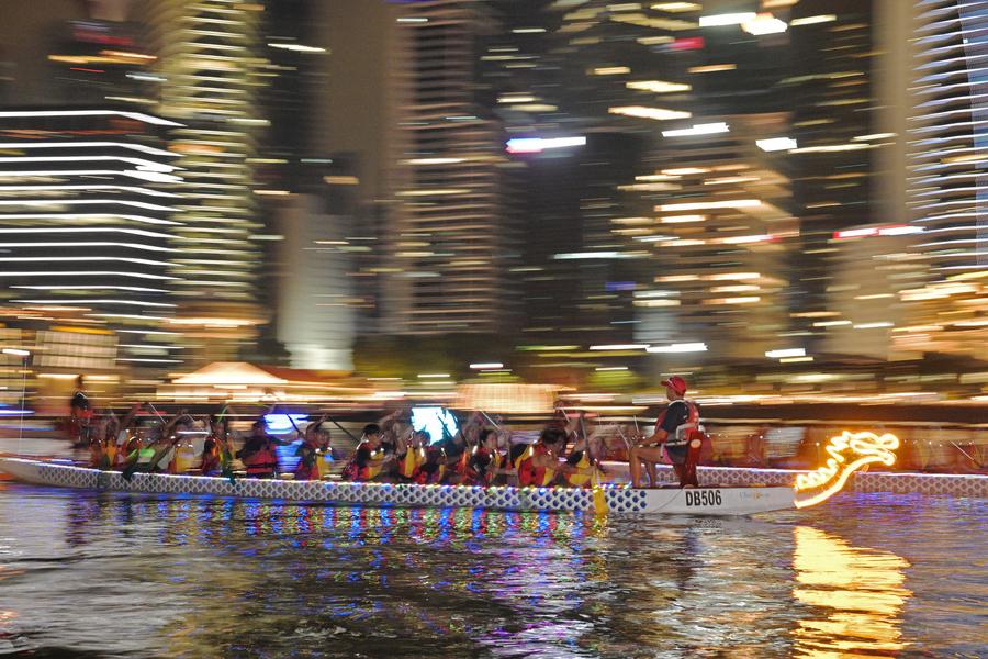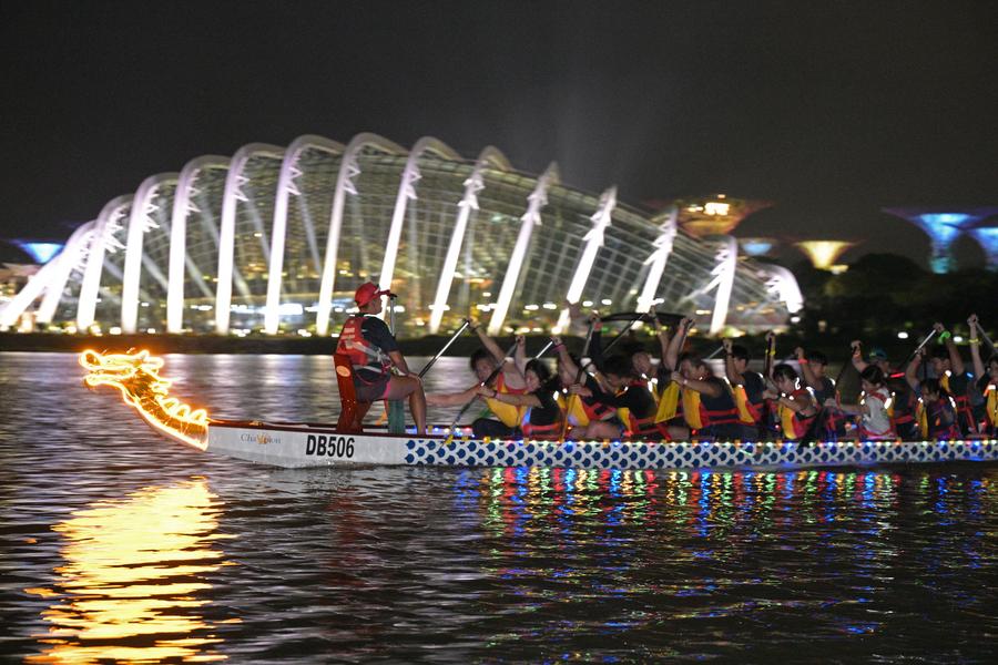 People practice rowing the dragon boat ahead of the Dragon Boat Festival which falls on June 10 this year, in Singapore, on June 8, 2024. (Photo by Then Chih Wey/Xinhua)