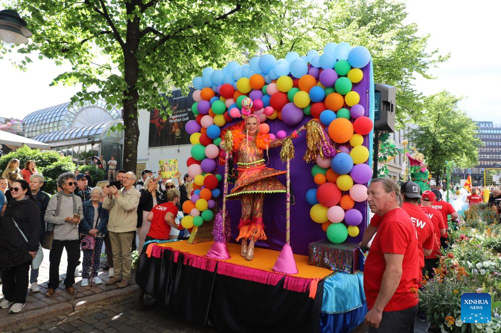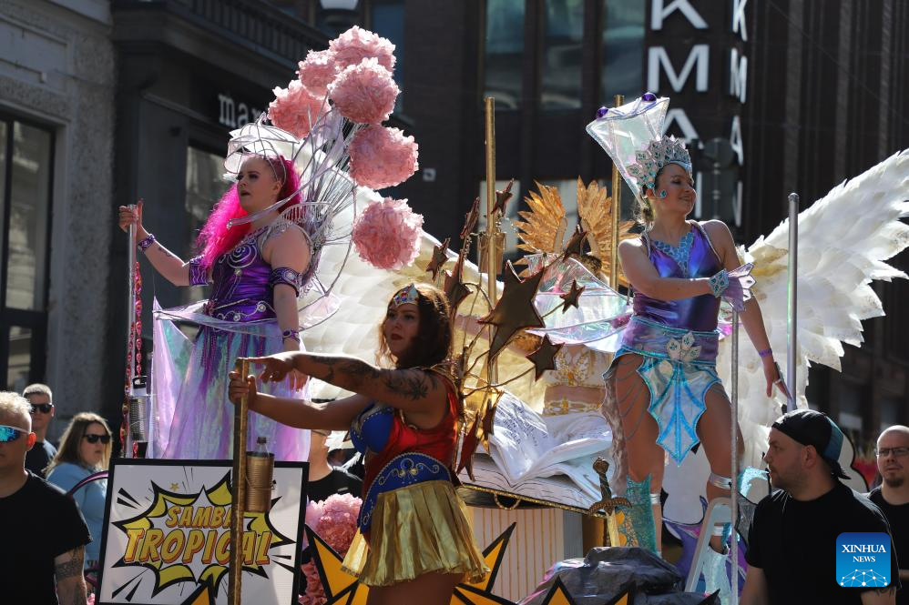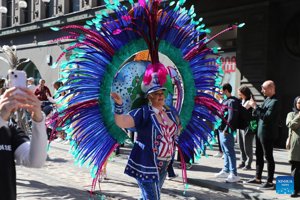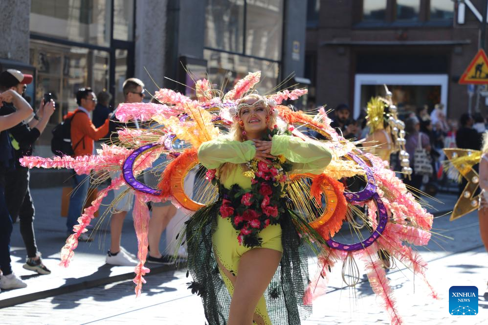 An artist performs in a parade during the Samba Festival in Helsinki, Finland, June 8, 2024. The carnaval reached its climax with a samba parade on Saturday. (Xinhua/Chen Jing)
