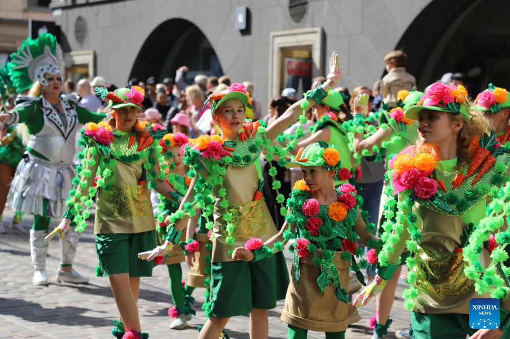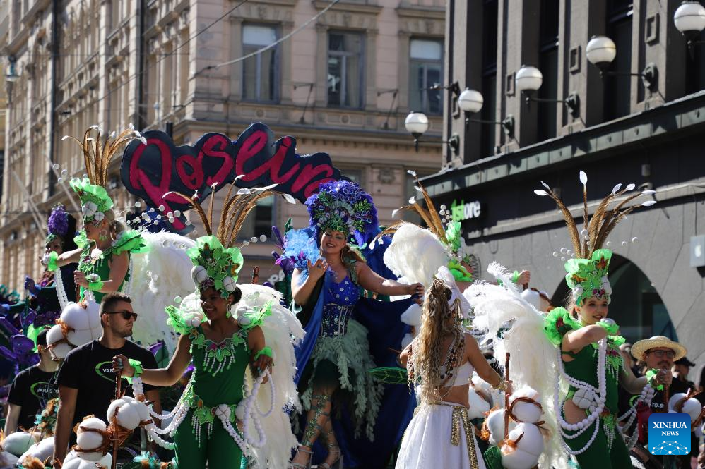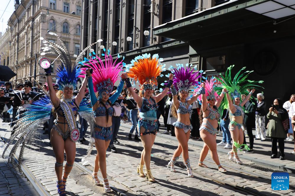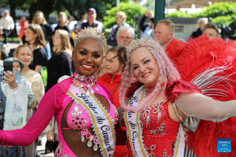 Artists perform in a parade during the Samba Festival in Helsinki, Finland, June 8, 2024. The carnaval reached its climax with a samba parade on Saturday. (Xinhua/Chen Jing)