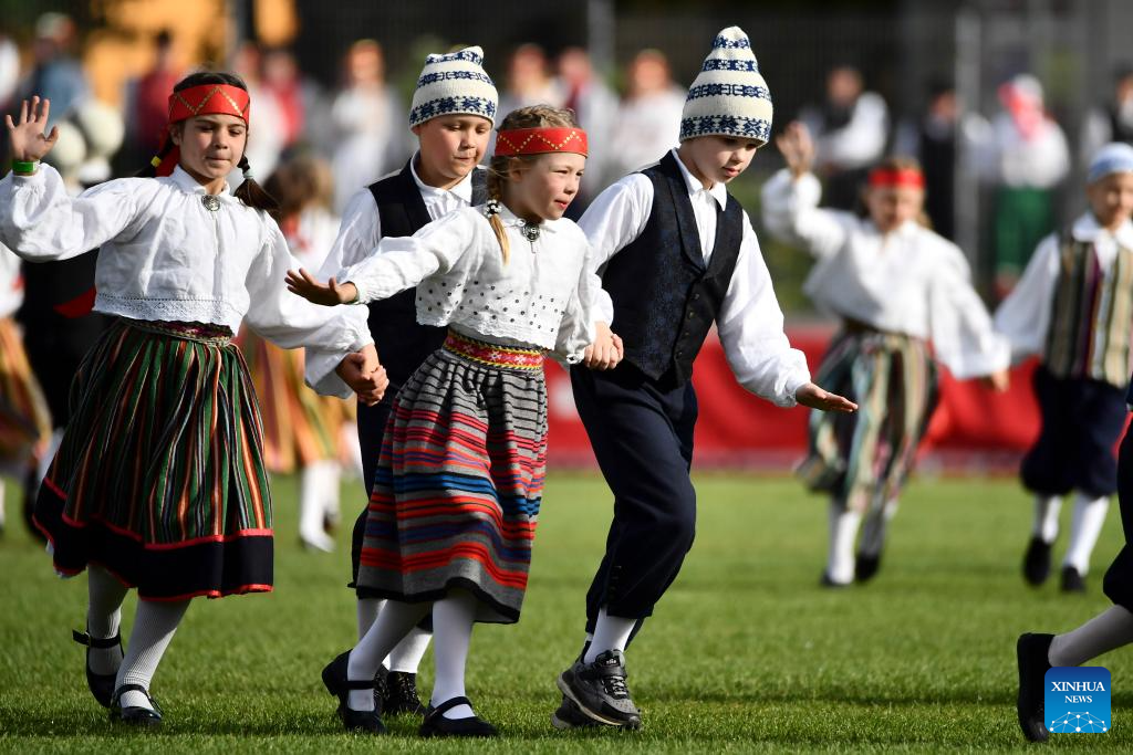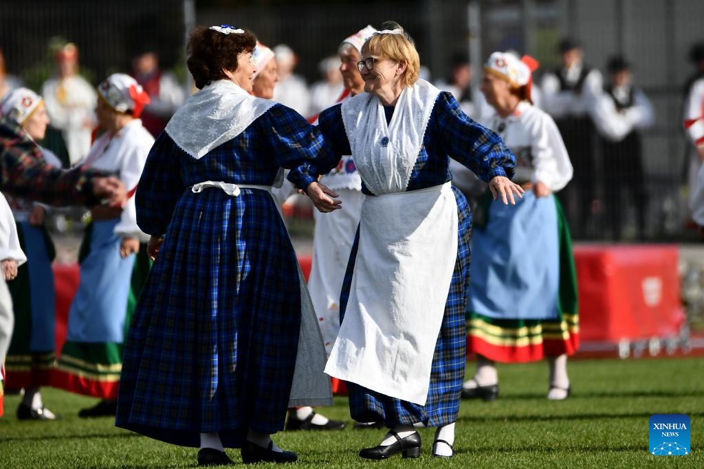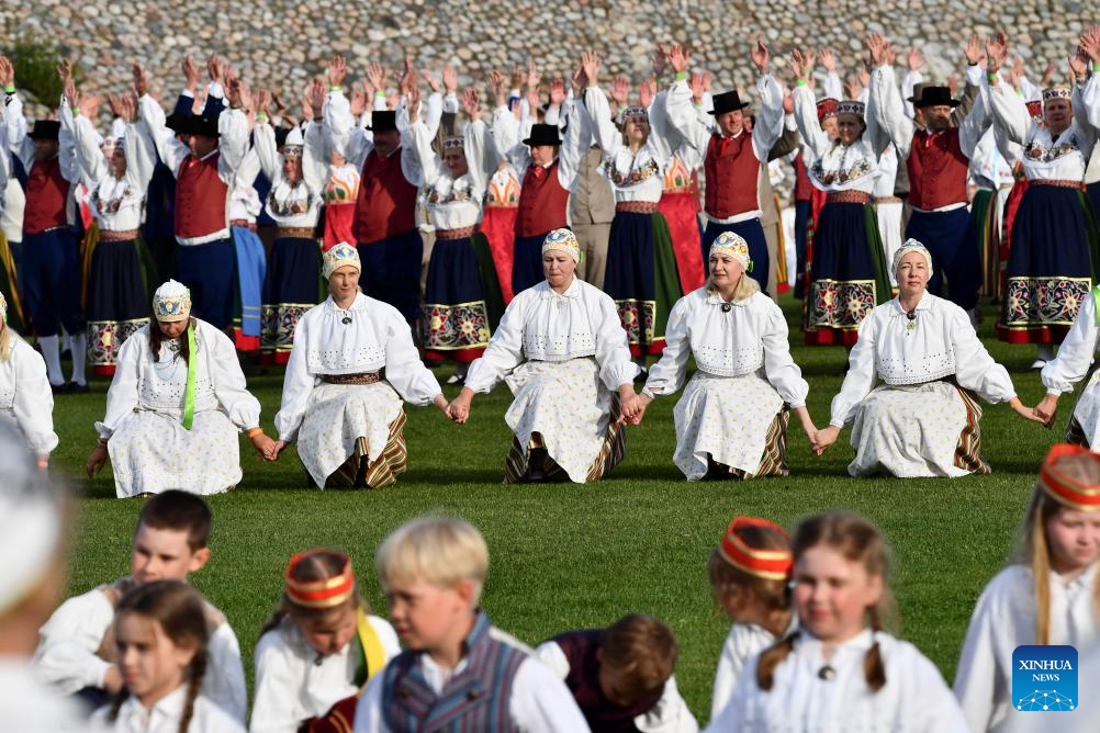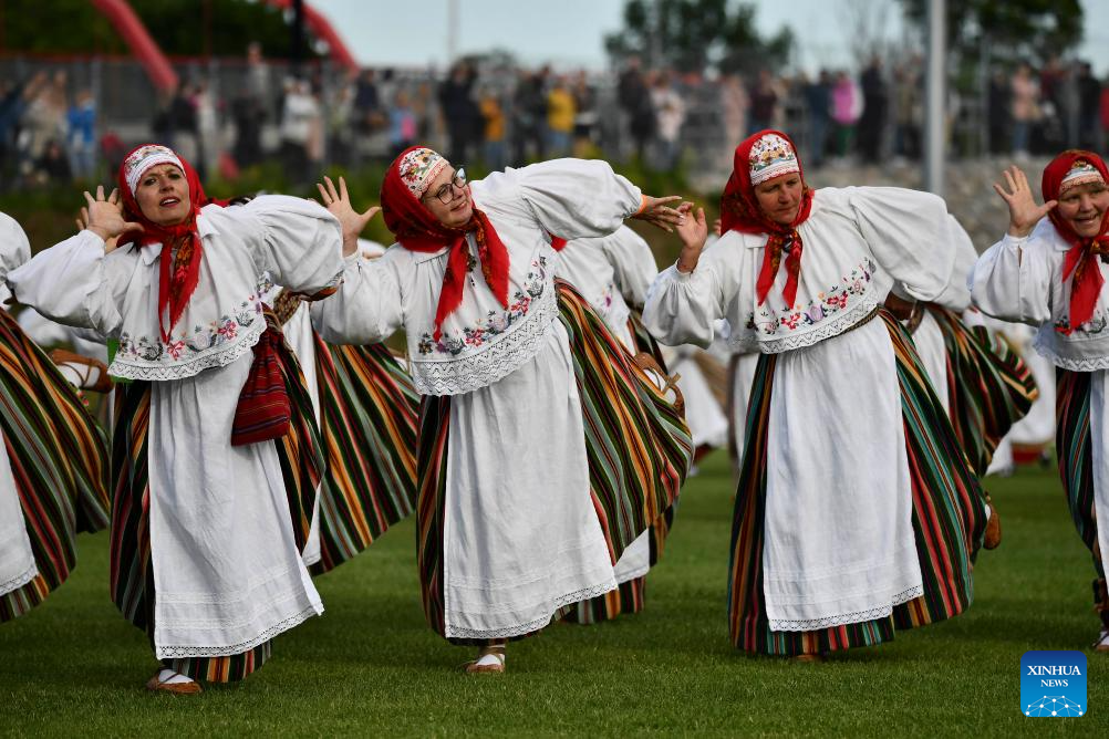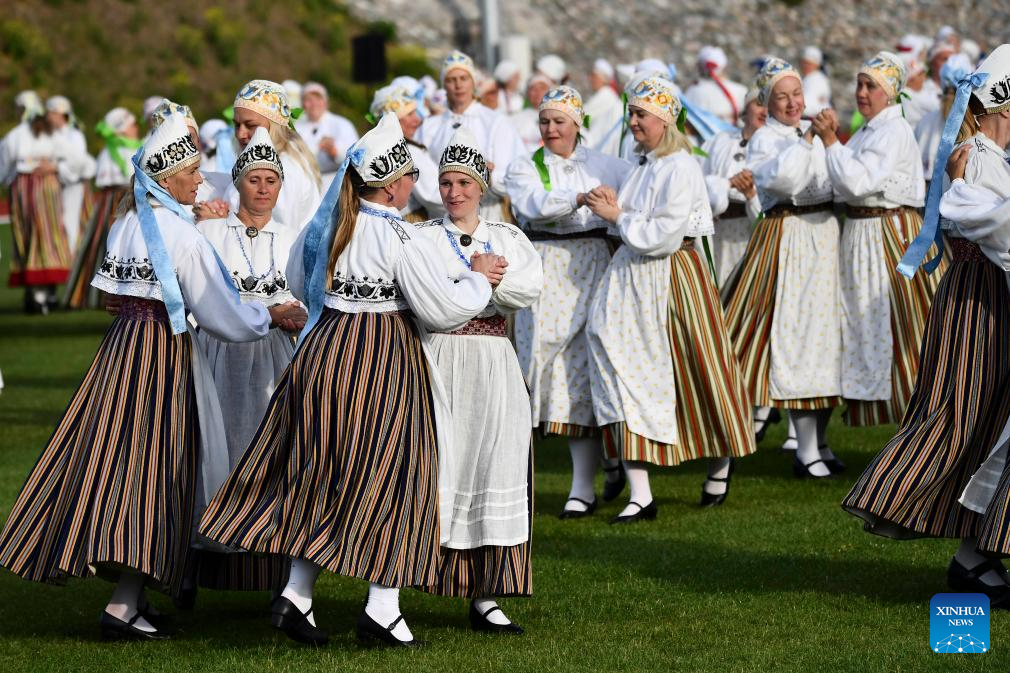 People in traditional Estonian folk costumes take part in a dance celebration in Johvi, Estonia on June 8, 2024. More than 1,200 folk dancers from about 100 troops took part in the celebration. (Photo by Sergei Stepanov/Xinhua)