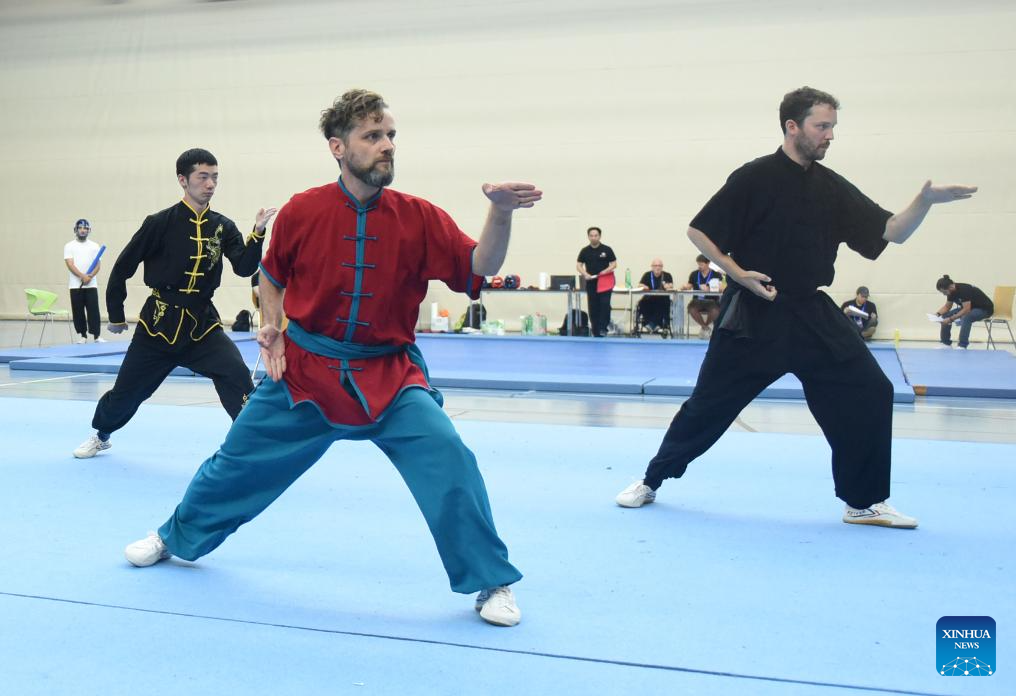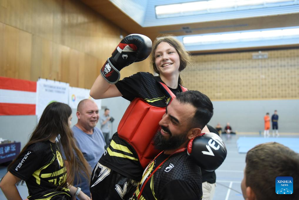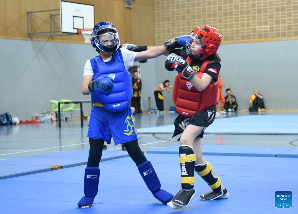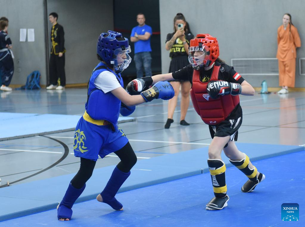 Contestants compete during the 13th Austrian Wushu Championship in Vienna, Austria, on June 8, 2024. (Xinhua/He Canling)