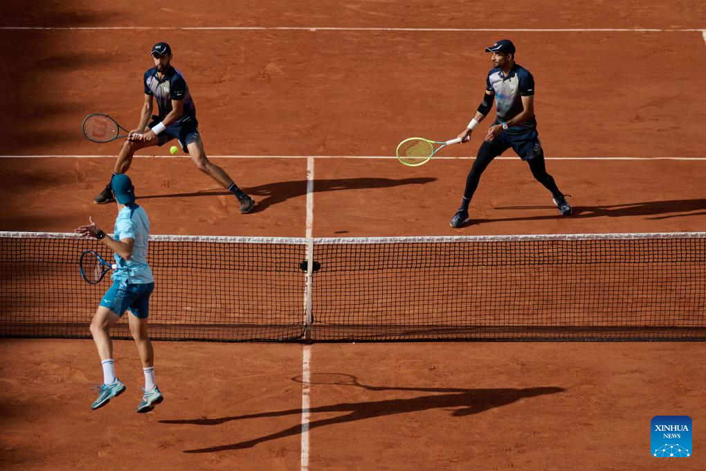 Marcelo Arevalo (R)/Mate Pavic (top L) compete during the men's doubles final match between Marcelo Arevalo (El Salvador)/Mate Pavic (Croatia) and Simone Bolelli/Andrea Vavassori of Italy at the French Open tennis tournament at Roland Garros in Paris, France, June 8, 2024. (Xinhua/Meng Dingbo)