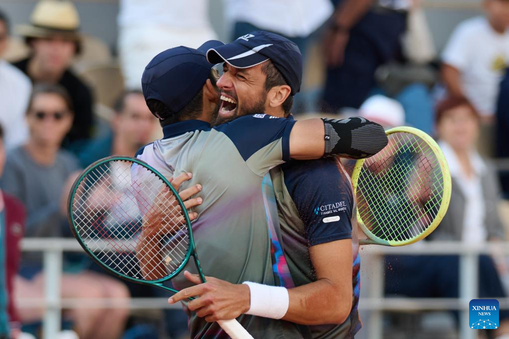 Marcelo Arevalo/Mate Pavic (R) celebrate the victory after the men's doubles final match between Marcelo Arevalo (El Salvador)/Mate Pavic (Croatia) and Simone Bolelli/Andrea Vavassori of Italy at the French Open tennis tournament at Roland Garros in Paris, France, June 8, 2024. (Xinhua/Meng Dingbo)