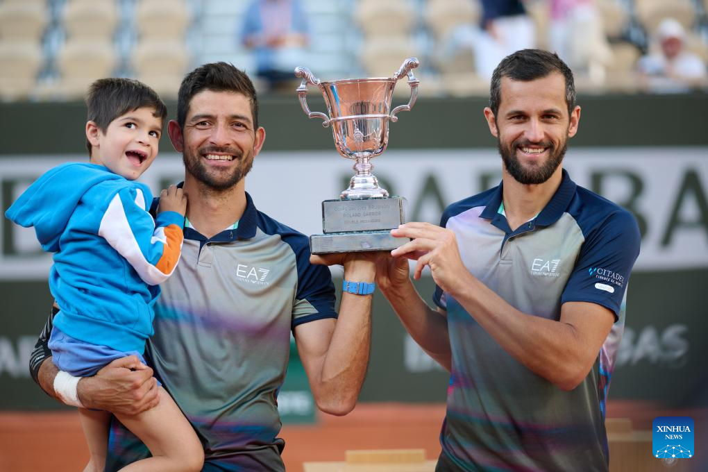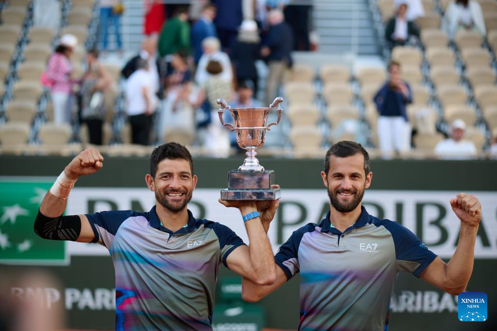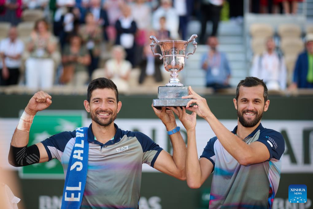 Winners Marcelo Arevalo/Mate Pavic (R) pose with their trophy during the award ceremoy after the men's doubles final match between Marcelo Arevalo (El Salvador)/ Mate Pavic (Croatia) and Simone Bolelli/Andrea Vavassori of Italy at the French Open tennis tournament at Roland Garros in Paris, France, June 8, 2024. (Xinhua/Meng Dingbo)