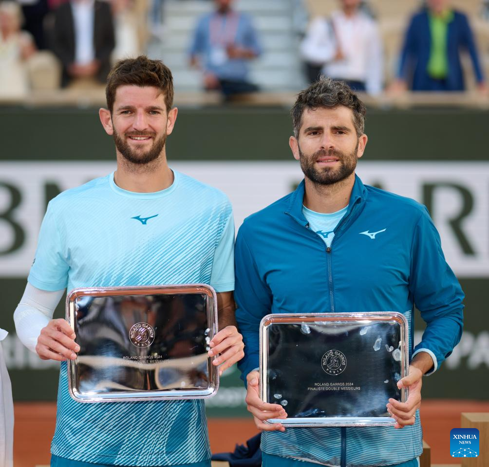 Runners-up Simone Bolelli (R)/Andrea Vavassori pose during the award ceremoy after the men's doubles final match between Marcelo Arevalo (El Salvador)/ Mate Pavic (Croatia) and Simone Bolelli/Andrea Vavassori of Italy at the French Open tennis tournament at Roland Garros in Paris, France, June 8, 2024. (Xinhua/Meng Dingbo)