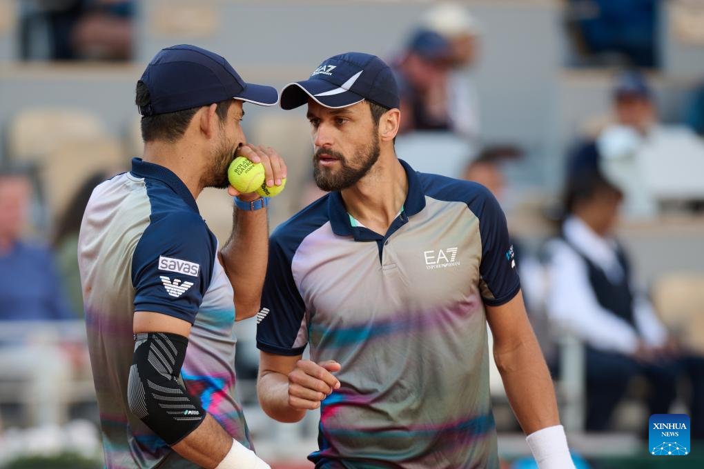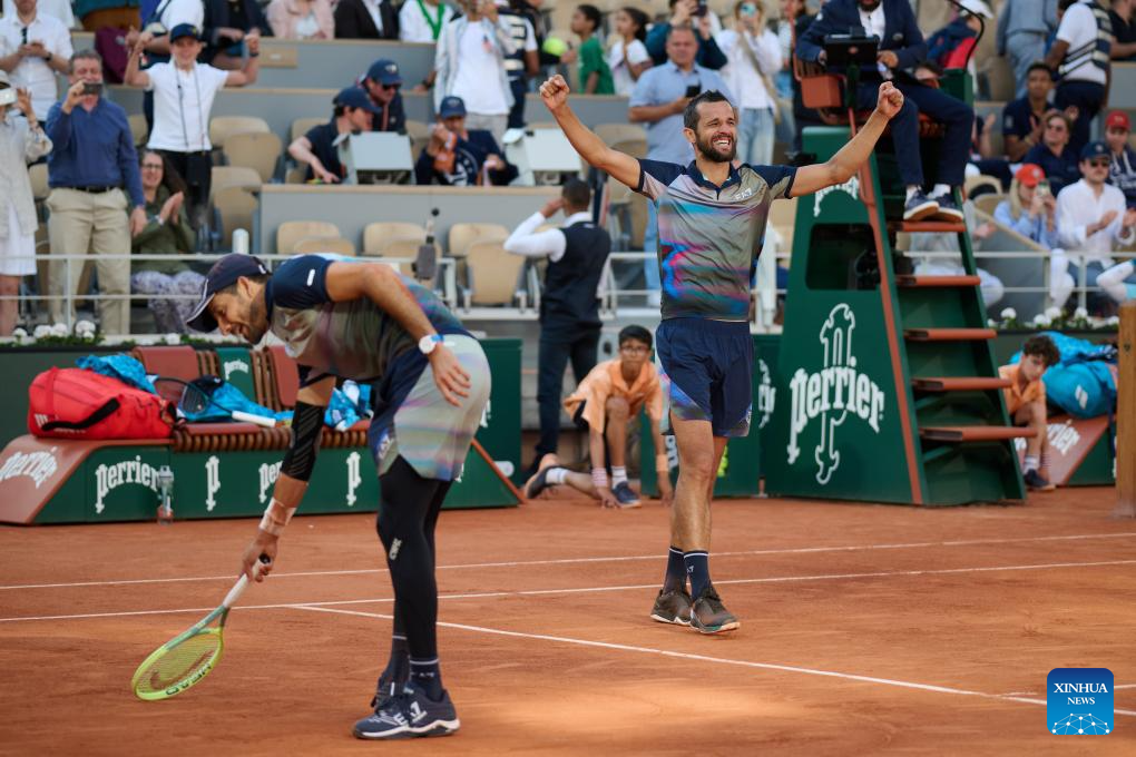 Marcelo Arevalo/Mate Pavic (R) react during the men's doubles final match between Marcelo Arevalo (El Salvador)/Mate Pavic (Croatia) and Simone Bolelli/Andrea Vavassori of Italy at the French Open tennis tournament at Roland Garros in Paris, France, June 8, 2024. (Xinhua/Meng Dingbo)