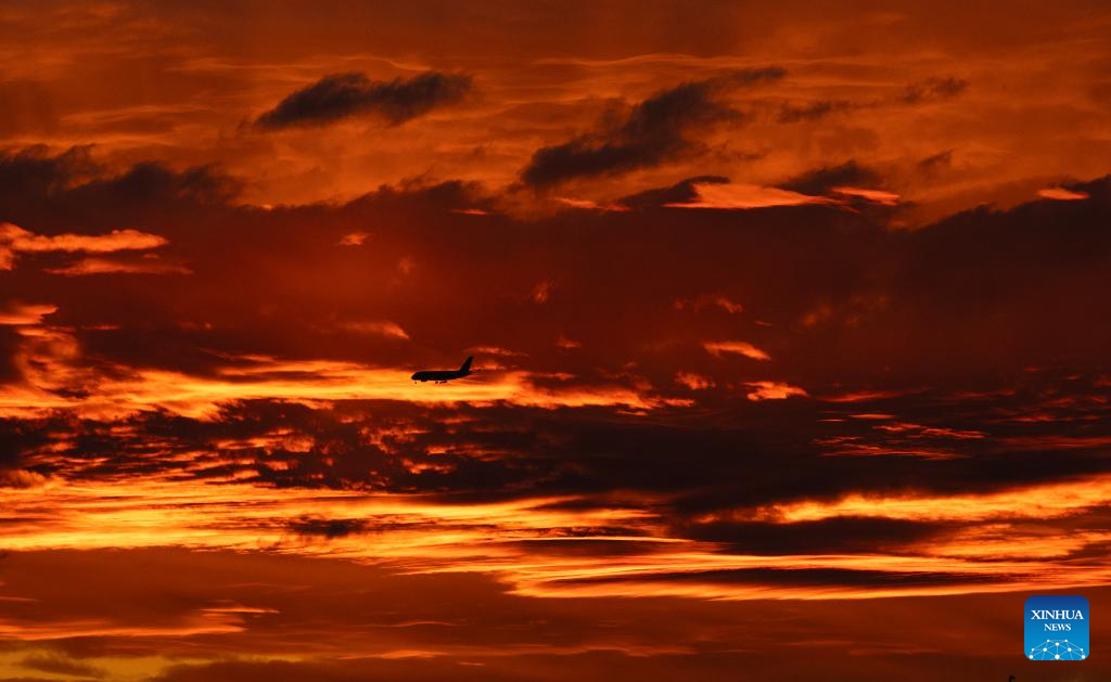This photo taken on June 9, 2024 shows a plane at sunset in Sydney, Australia. (Xinhua/Ma Ping)