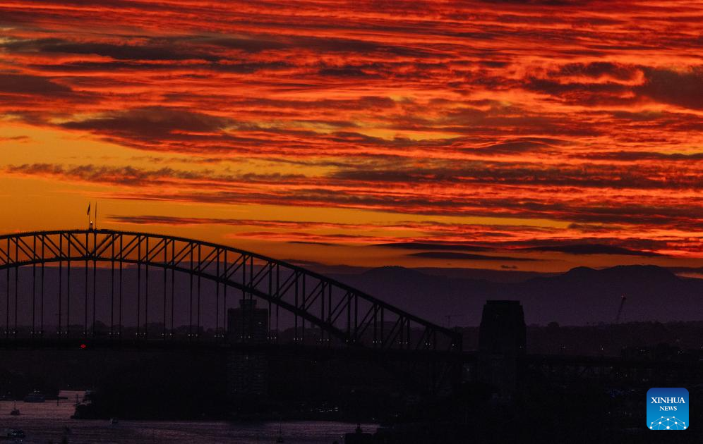 This photo taken on June 9, 2024 shows sunset view of Harbor Bridge in Sydney, Australia. (Xinhua/Ma Ping)