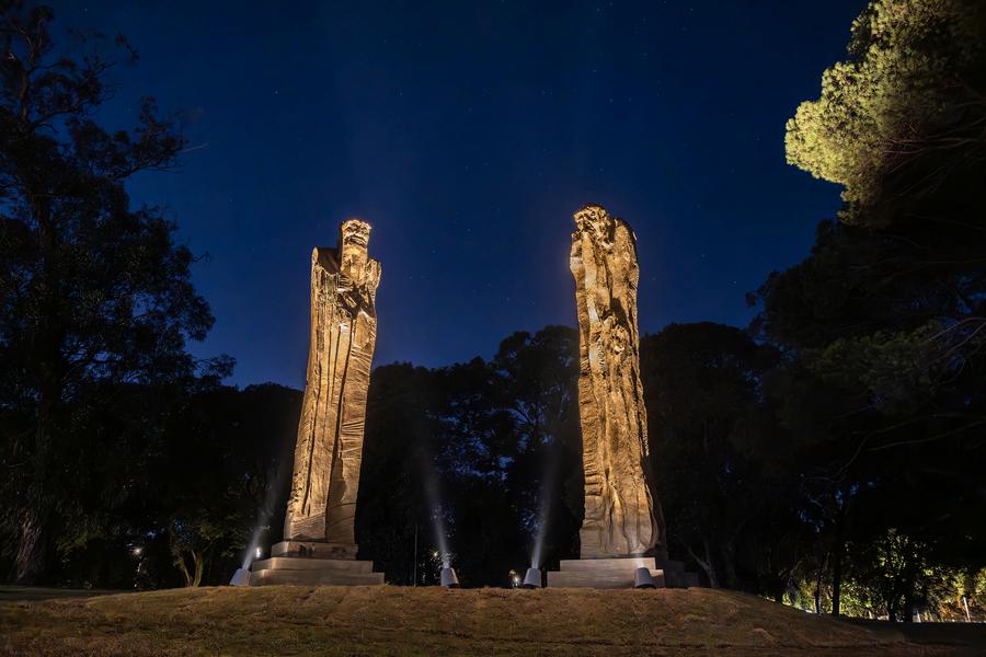 Six years later, the two sculptures crossed the ocean and were placed among the trees in Batlle Park. When the sculptures were slowly lowered from a giant crane and finally touched the ground, Wu, who was watching the video remotely, was "extremely excited."