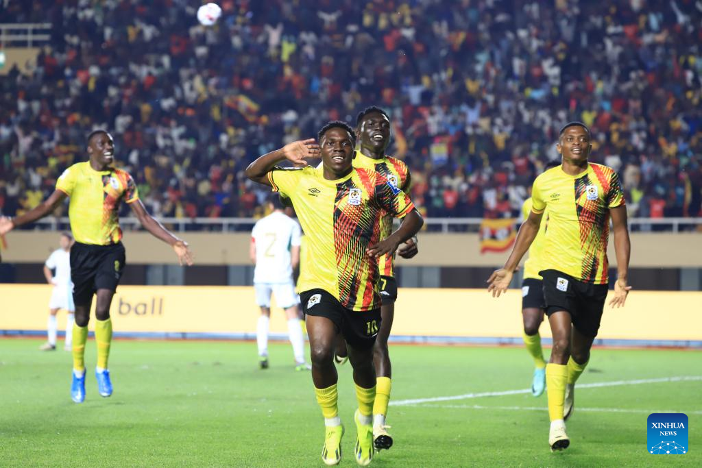 Travis Mutyaba (front) of Uganda celebrates scoring during the Group G match of the FIFA World Cup 2026 qualifiers between Uganda and Algeria in Kampala, the capital of Uganda, June 10, 2024. (Photo by Hajarah Nalwadda/Xinhua)