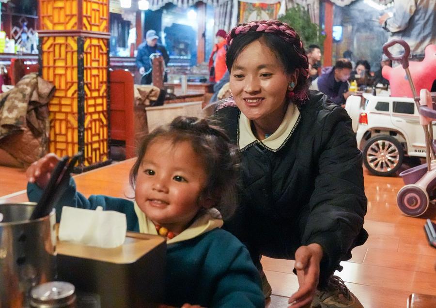 LHASA, June 12 (Xinhua) -- It was already 10 at night, but Tsering Geden and his wife were still bustling around their restaurant filled with tourists from all over the world. The warm atmosphere inside formed a stark contrast to the chilly air outside at the foot of the world's highest peak -- the 8,848-meter Mount Qomolangma.