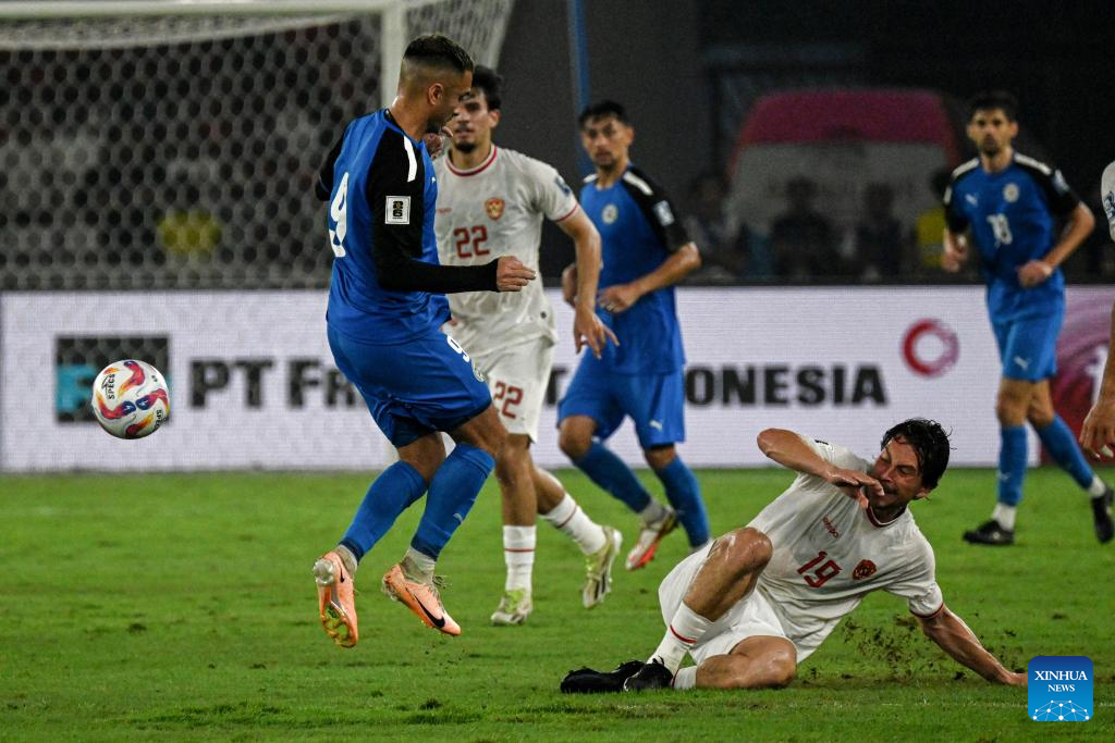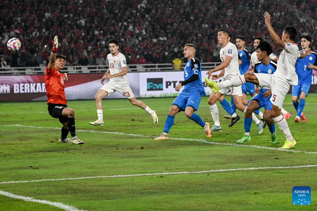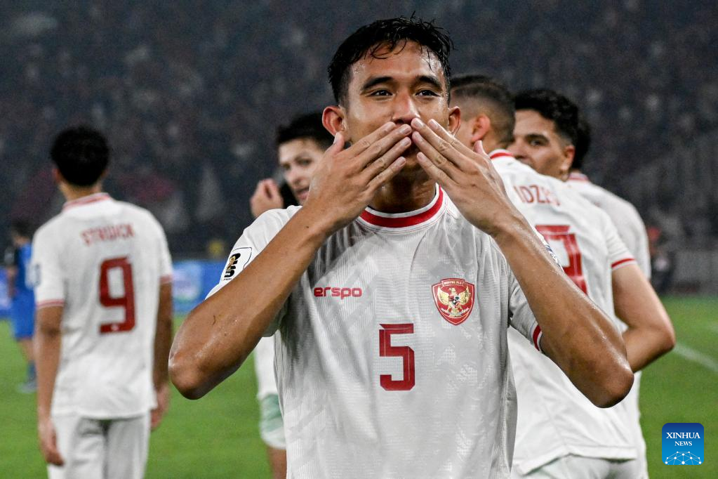 Rizky Ridho of Indonesia celebrates scoring during the Group F match of 2026 FIFA World Cup Asian qualifiers between Indonesia and the Philippines in Jakarta, Indonesia, June 11, 2024. (Xinhua/Agung Kuncahya B.)