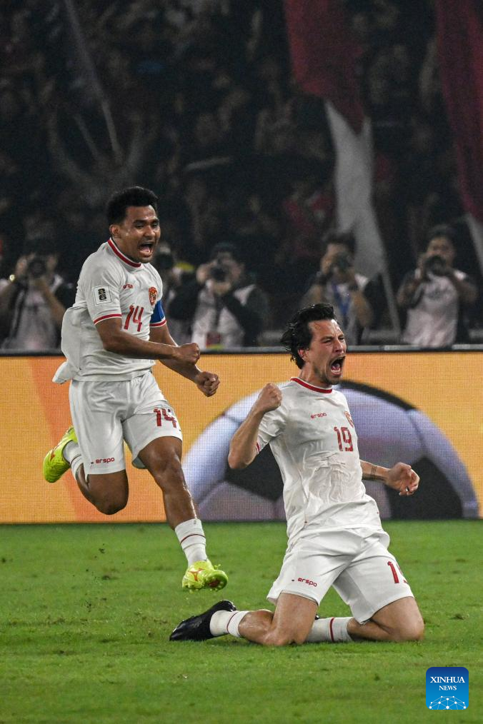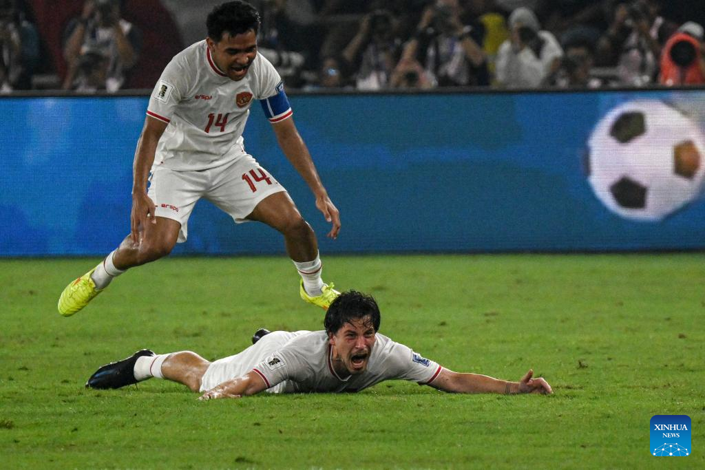Thom Haye (C) of Indonesia celebrates scoring during the Group F match of 2026 FIFA World Cup Asian qualifiers between Indonesia and the Philippines in Jakarta, Indonesia, June 11, 2024. (Xinhua/Agung Kuncahya B.)