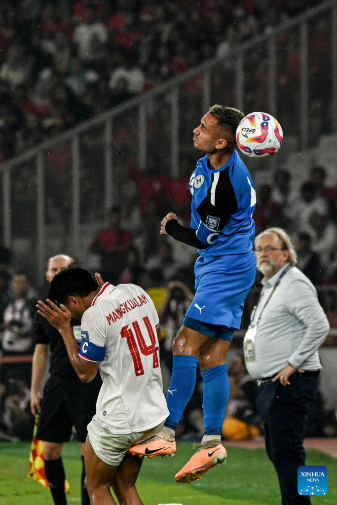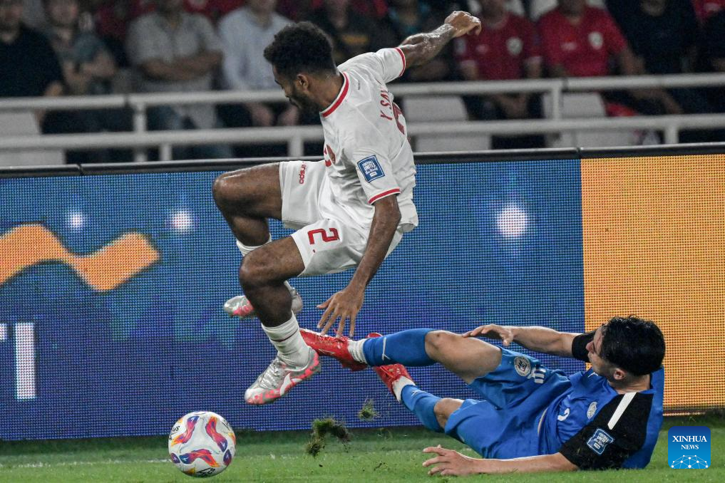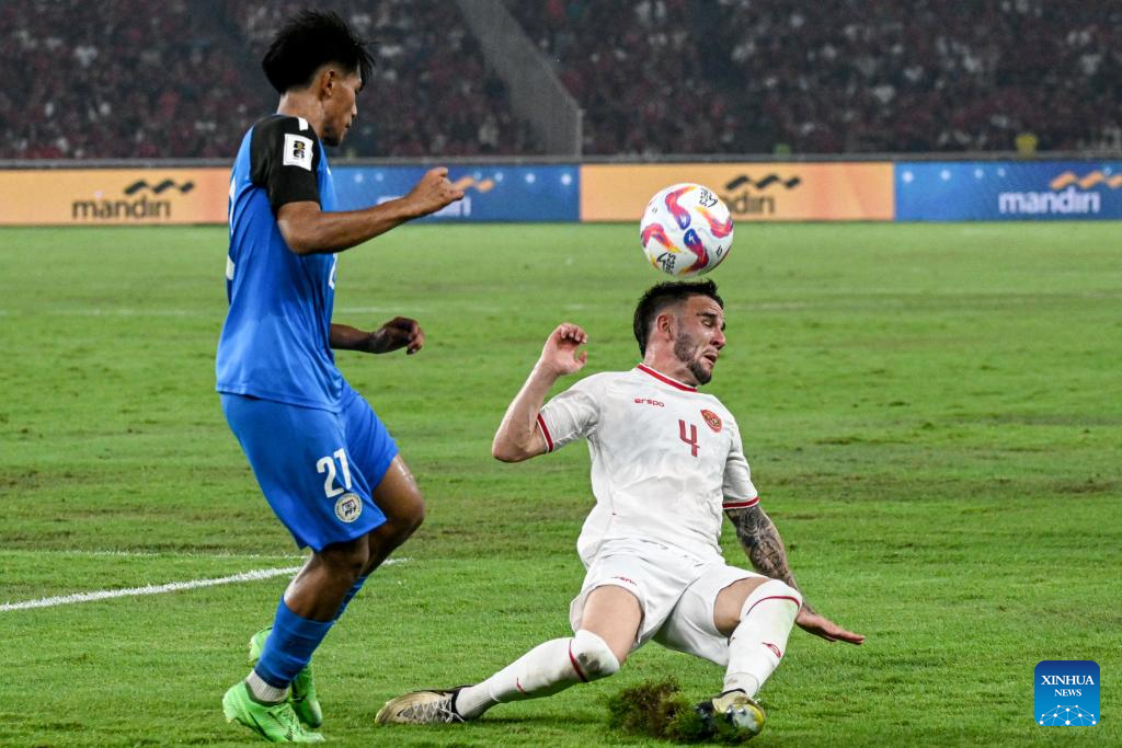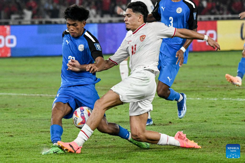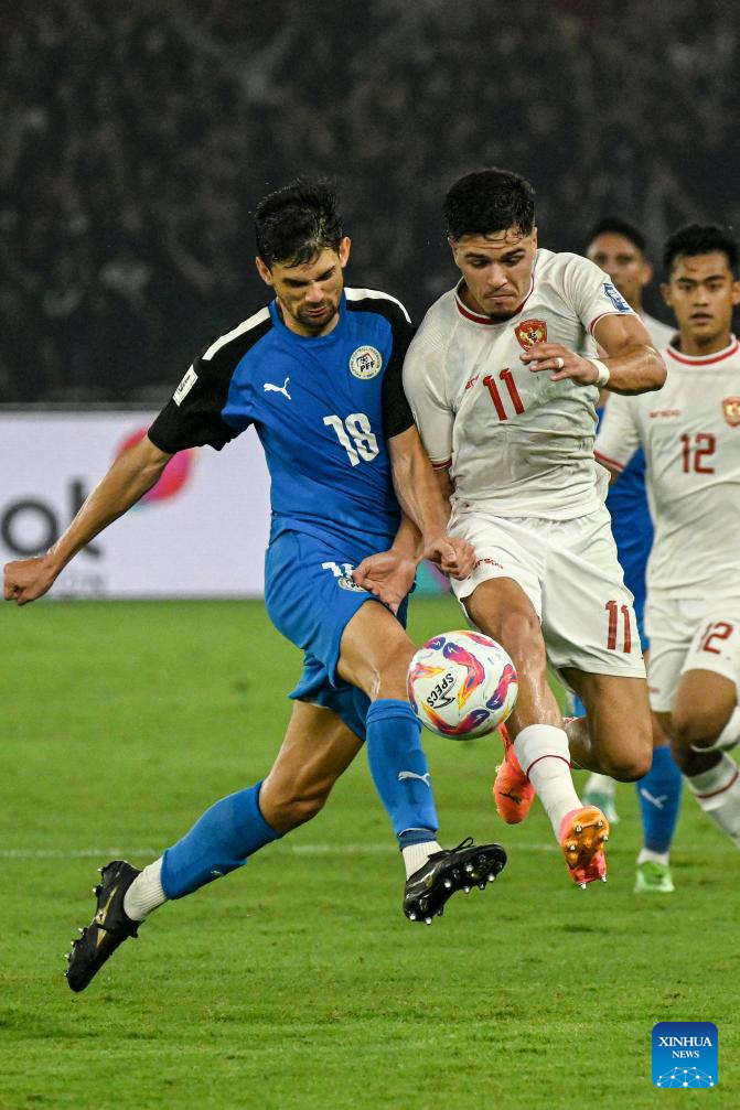 Ragnar Oratmangoen (R) of Indonesia vies for the ball during the Group F match of 2026 FIFA World Cup Asian qualifiers between Indonesia and the Philippines in Jakarta, Indonesia, June 11, 2024. (Xinhua/Agung Kuncahya B.)