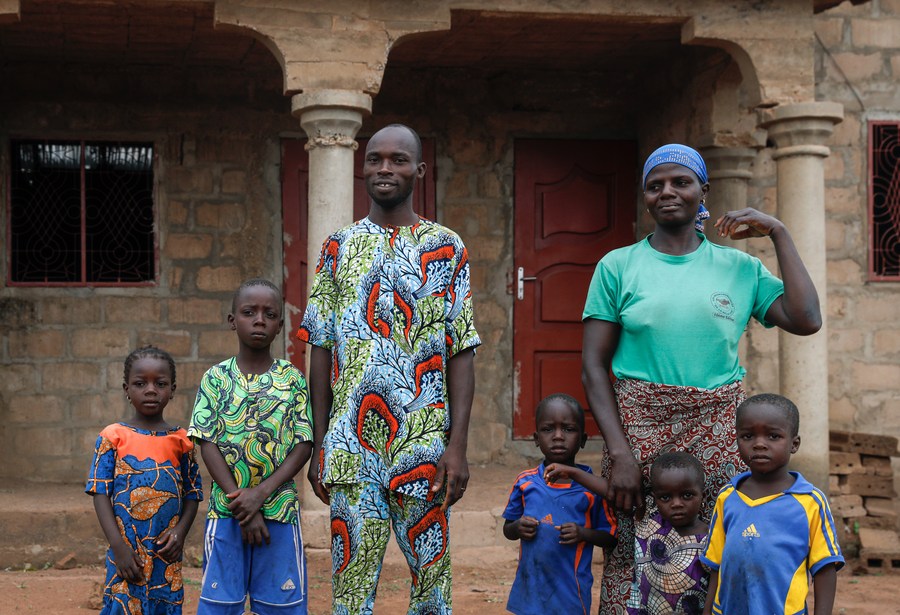 Donatien Ezin (3rd L) and his family pose for a photo in front of their house in Belle Cite village, near the central city of Parakou, Benin, May 25, 2024. (Xinhua/Li Yahui)
