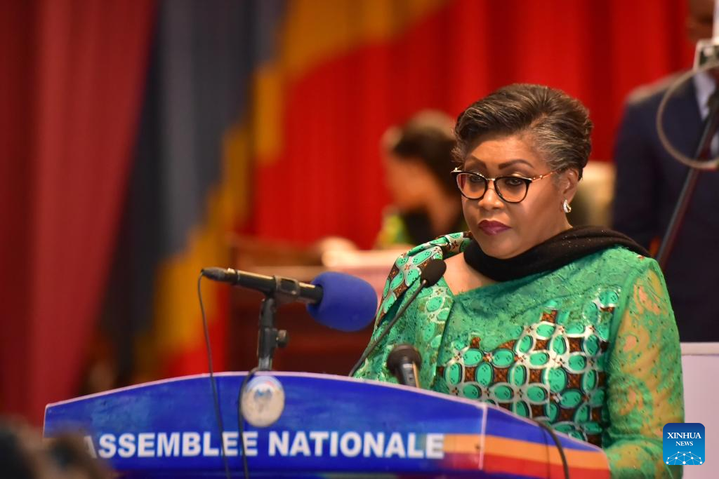 Judith Suminwa Tuluka speaks at the swearing-in ceremony in Kinshasa, the Democratic Republic of the Congo (DRC), June 11, 2024. Judith Suminwa Tuluka was sworn in early Wednesday as the first female prime minister of the DRC, with an "ambitious and detailed" action plan that will cost 92.9 billion U.S. dollars over the next five years. (Str/Xinhua)