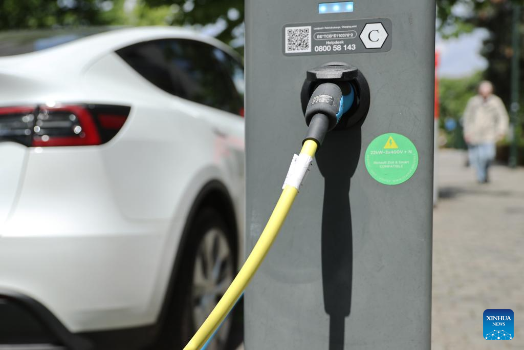 This file photo taken on June 6, 2024 shows an electric car at a charging station near the European Commission building in Brussels, Belgium. The European Commission on Wednesday issued a statement to pre-disclose the level of protectionist provisional duties it would impose on imports of battery electric vehicles (EVs) from China.