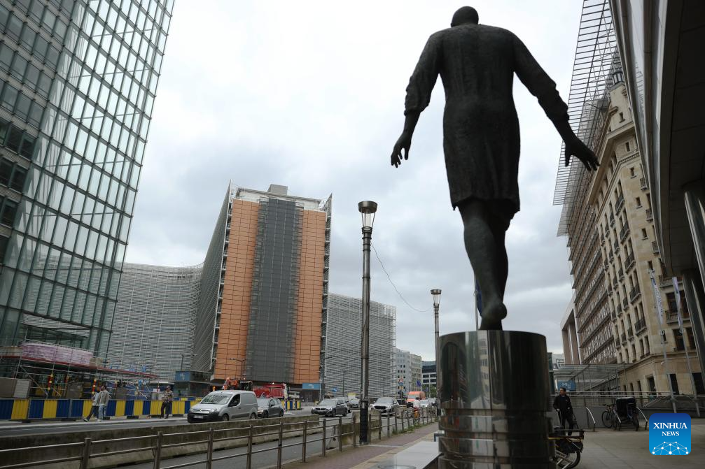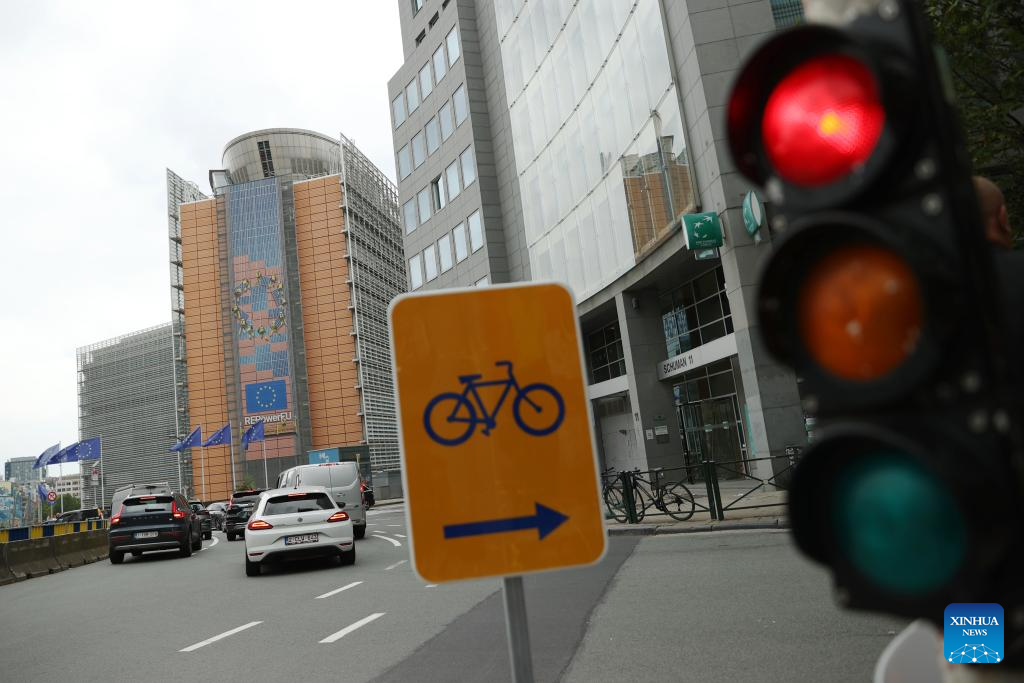 This file photo taken on June 3, 2024 shows vehicles passing by the European Commission building in Brussels, Belgium. The European Commission on Wednesday issued a statement to pre-disclose the level of protectionist provisional duties it would impose on imports of battery electric vehicles (EVs) from China.