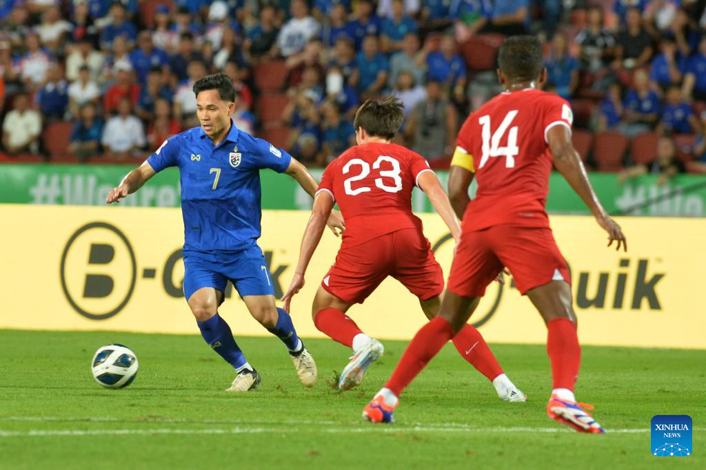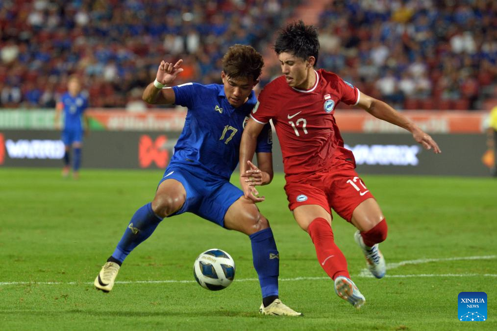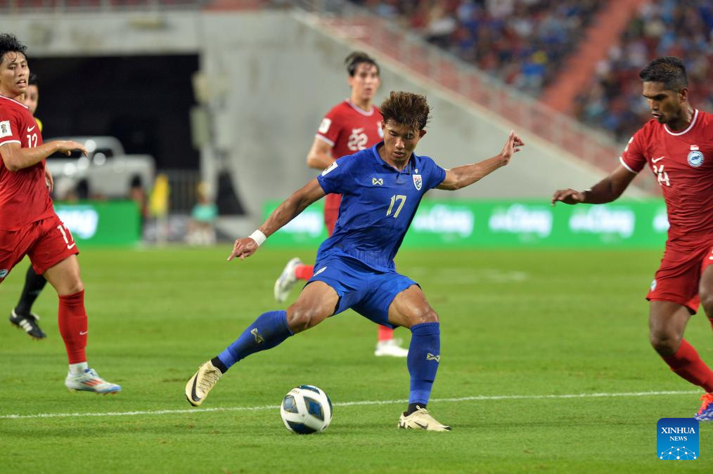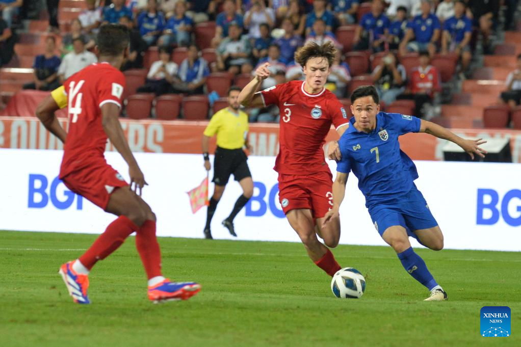 Supachok Sarachat (R) of Thailand vies with Ryhan Stewart (C) of Singapore during the Group C match of 2026 FIFA World Cup Asian qualifiers between Thailand and Singapore in Bangkok, Thailand, June 11, 2024. (Xinhua/Rachen Sageamsak)