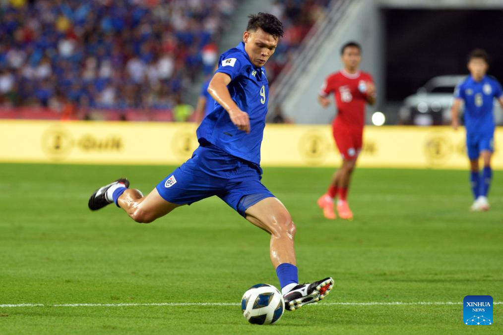 Suphanat Mueanta (C) of Thailand competes during the Group C match of 2026 FIFA World Cup Asian qualifiers between Thailand and Singapore in Bangkok, Thailand, June 11, 2024. (Xinhua/Rachen Sageamsak)