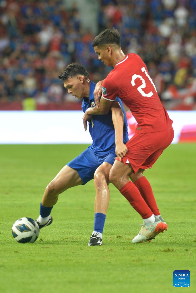 Suphanat Mueanta (L) of Thailand vies with Glenn Kweh of Singapore during the Group C match of 2026 FIFA World Cup Asian qualifiers between Thailand and Singapore in Bangkok, Thailand, June 11, 2024. (Xinhua/Rachen Sageamsak)