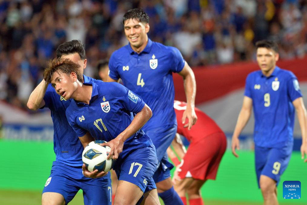 Supachok Sarachat (L) of Thailand competes during the Group C match of 2026 FIFA World Cup Asian qualifiers between Thailand and Singapore in Bangkok, Thailand, June 11, 2024. (Xinhua/Rachen Sageamsak)
