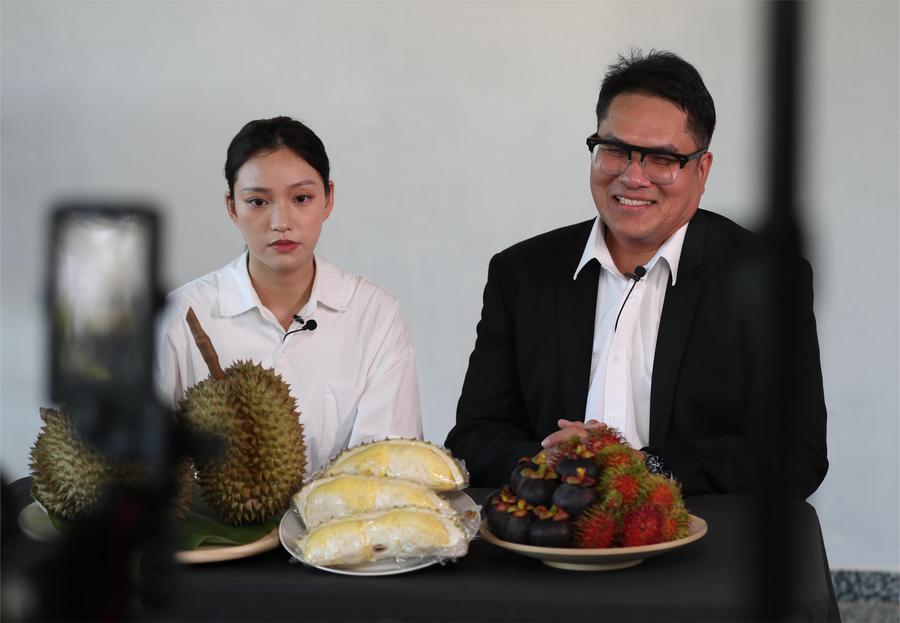 CHANTHABURI, Thailand, June 13 (Xinhua) -- At a durian orchard in Thailand's Chanthaburi province, a Thai orchard owner and a Chinese social media influencer were promoting durians to Chinese netizens through the livestreaming e-commerce platform Tmall.