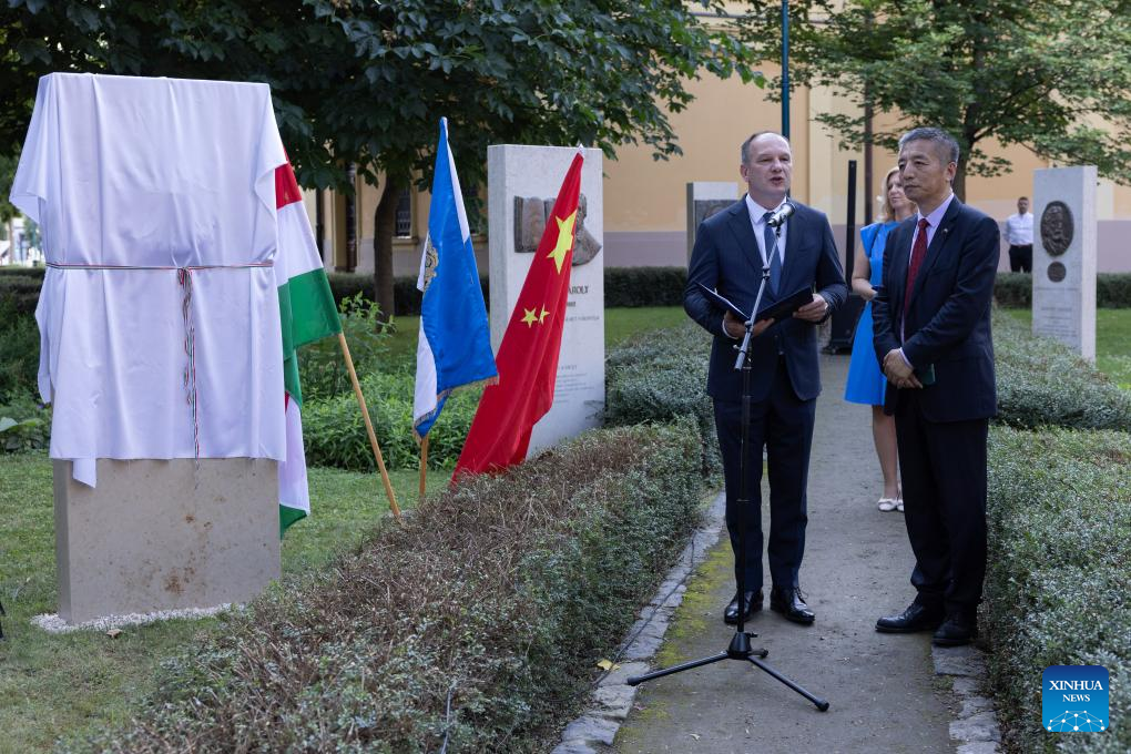 This photo taken on June 11, 2024 shows the statue of Bai Mang in Kiskunfelegyhaza, Hungary. A statue was unveiled on Tuesday to honor Bai Mang, the Chinese translator of Hungary's most renowned poet: Sandor Petofi. (Photo by Attila Volgyi/Xinhua)