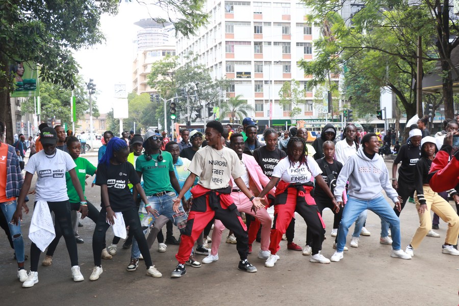 Kenyan youth dance in a street in Nairobi, capital of Kenya, on Nov. 26, 2023. (Photo by Allan Mutiso/Xinhua)