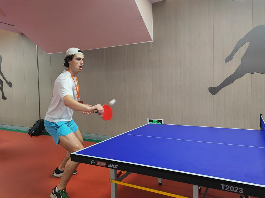 During a table tennis lesson, Clarke, who has a ping-pong table in his garage in the United States, practiced with Chinese students to improve his skills, while in a carpentry class, he marveled at a wooden bridge model featuring a traditional mortise-and-tenon structure, without a single nail.