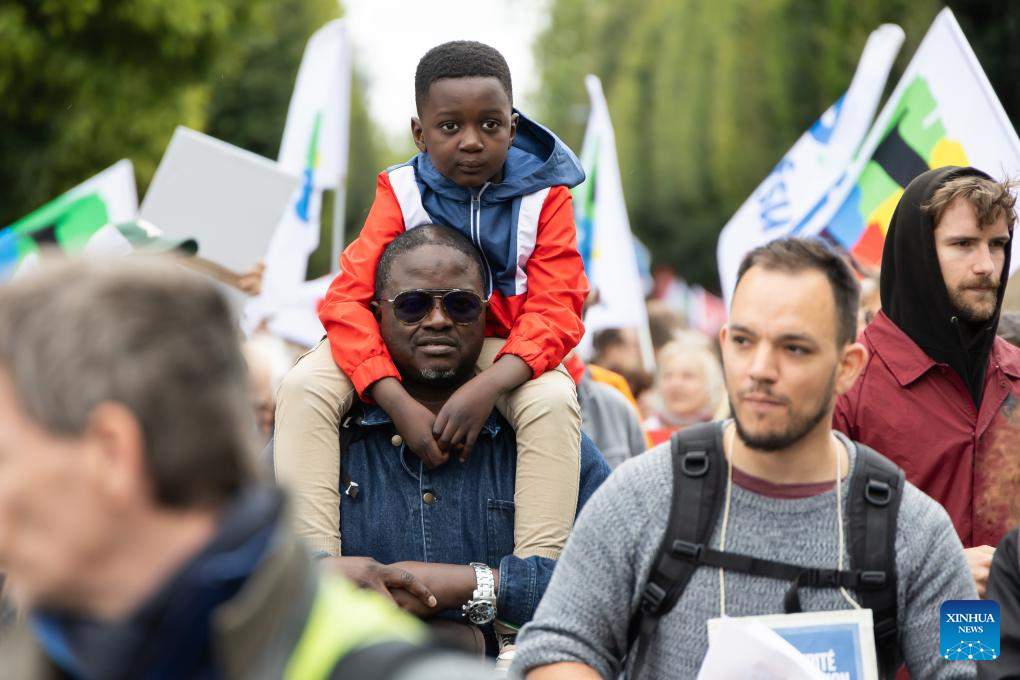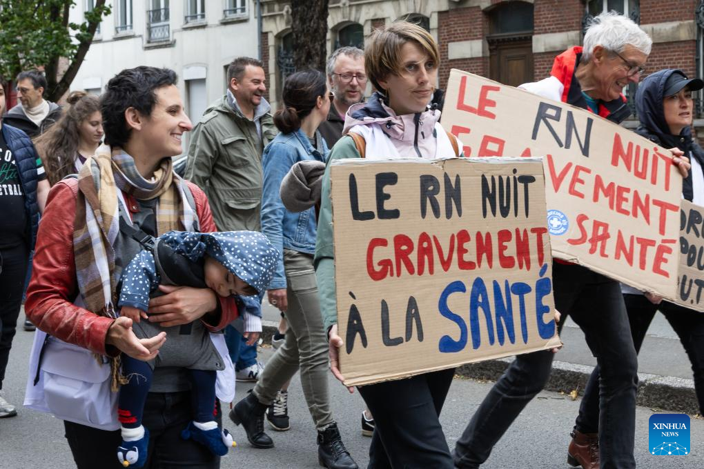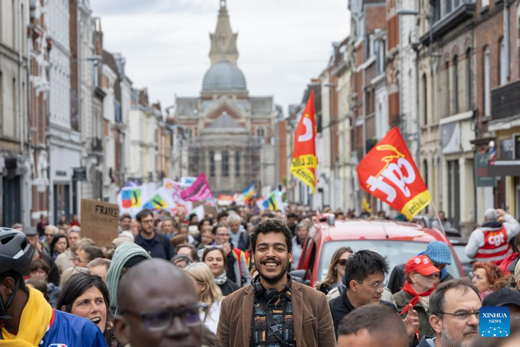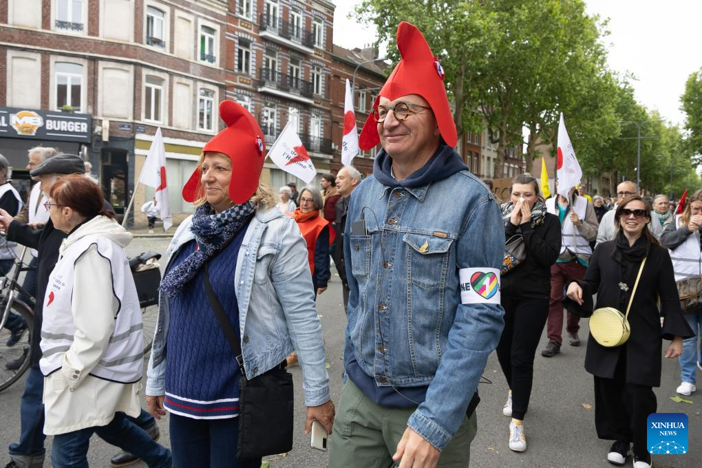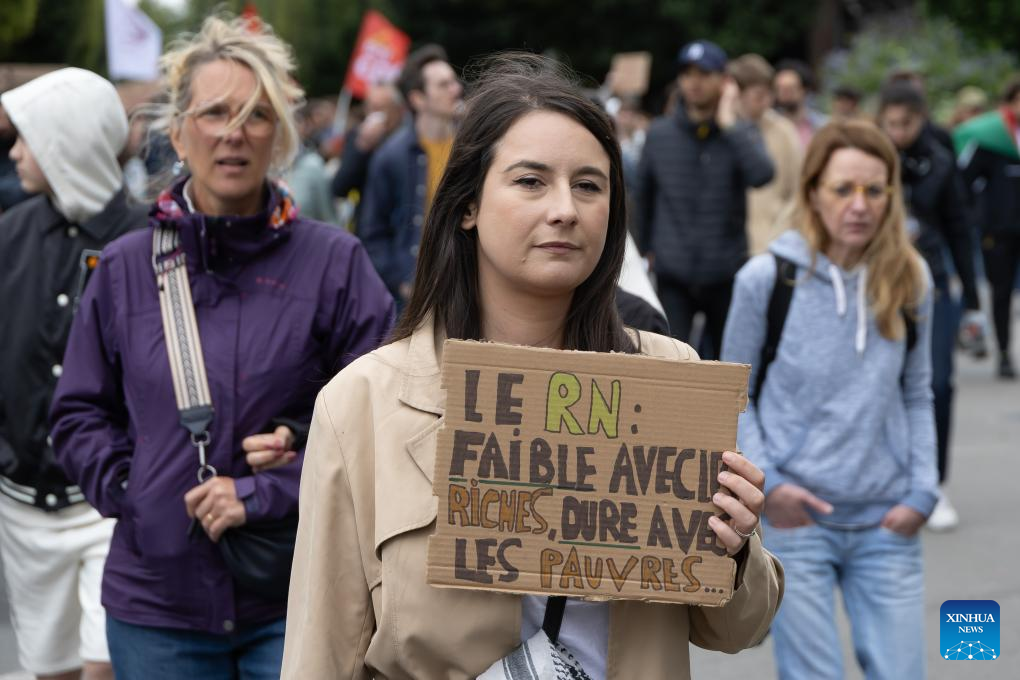 People participate in a demonstration against the far-right, in Lille, northern France, June 15, 2024. A total of 250,000 people went to the streets in France on Saturday, including 75,000 in Paris, to protest against the far-right, according to the police. (Photo by Sebastien Courdji/Xinhua)