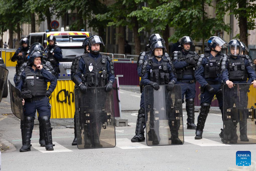 Policemen stand guard during a demonstration against the far-right, in Lille, northern France, June 15, 2024. A total of 250,000 people went to the streets in France on Saturday, including 75,000 in Paris, to protest against the far-right, according to the police. (Photo by Sebastien Courdji/Xinhua)