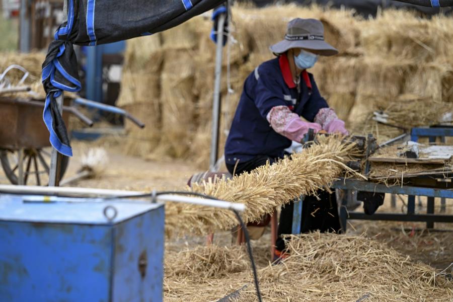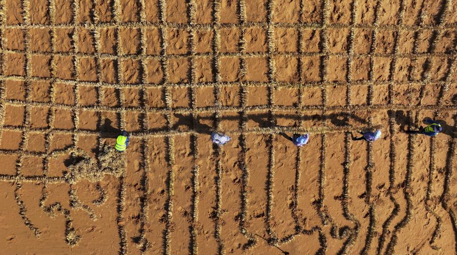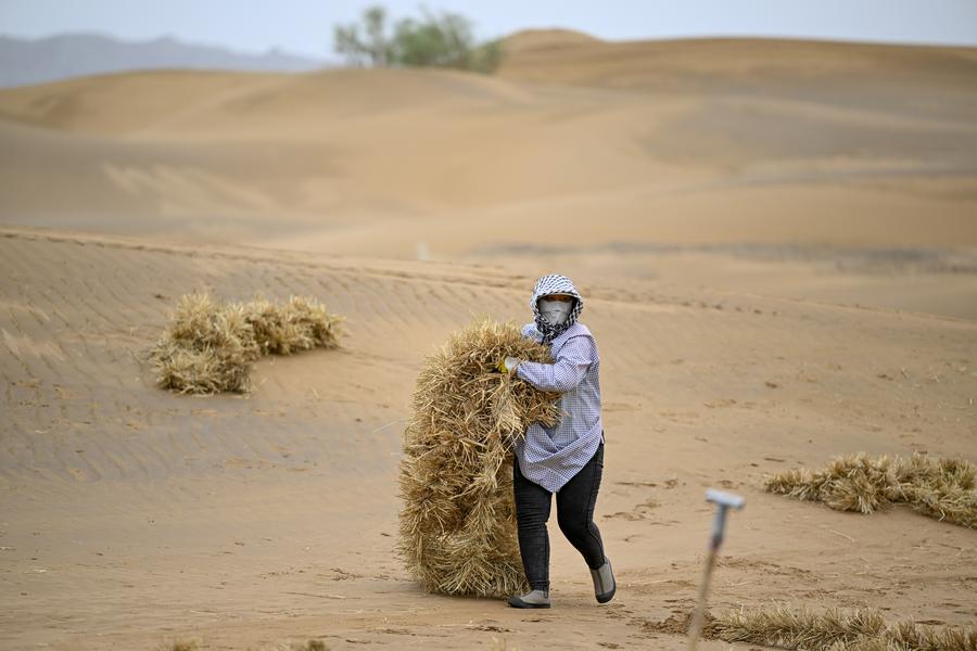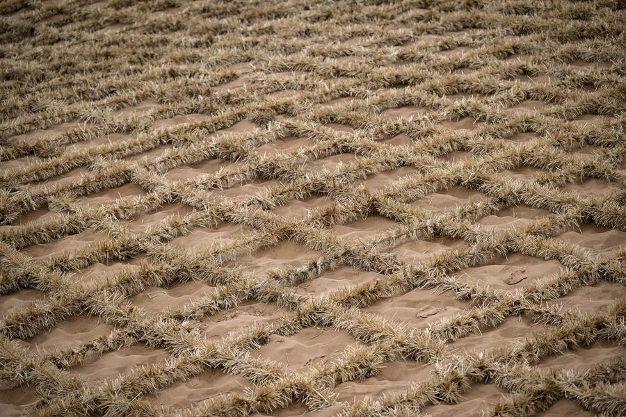 Workers set up straw checkerboards in Zhongwei, northwest China's Ningxia Hui Autonomous Region, June 13, 2019. (Xinhua/Feng Kaihua)Workers produce straw checkerboard materials in Zhongwei of northwest China's Ningxia Hui Autonomous Region, May 29, 2024. (Xinhua/Feng Kaihua)An aerial drone photo taken on May 29, 2024 shows straw checkerboards in the Tengger Desert, northwest China's Ningxia Hui Autonomous Region. (Xinhua/Feng Kaihua)Workers pave straw checkerboards in the Tengger Desert, in Zhongwei of northwest China's Ningxia Hui Autonomous Region, May 30, 2024. (Xinhua/Feng Kaihua)